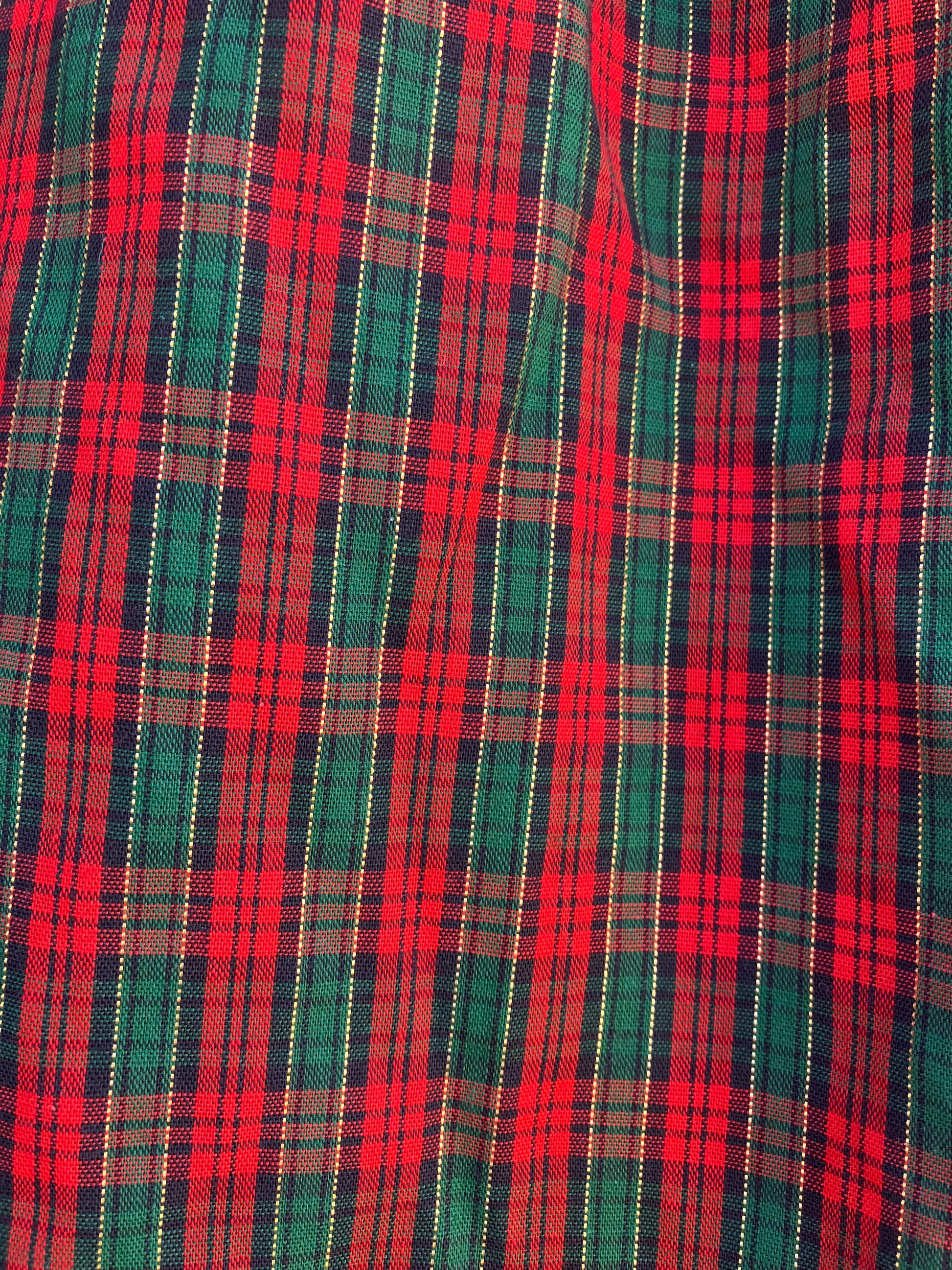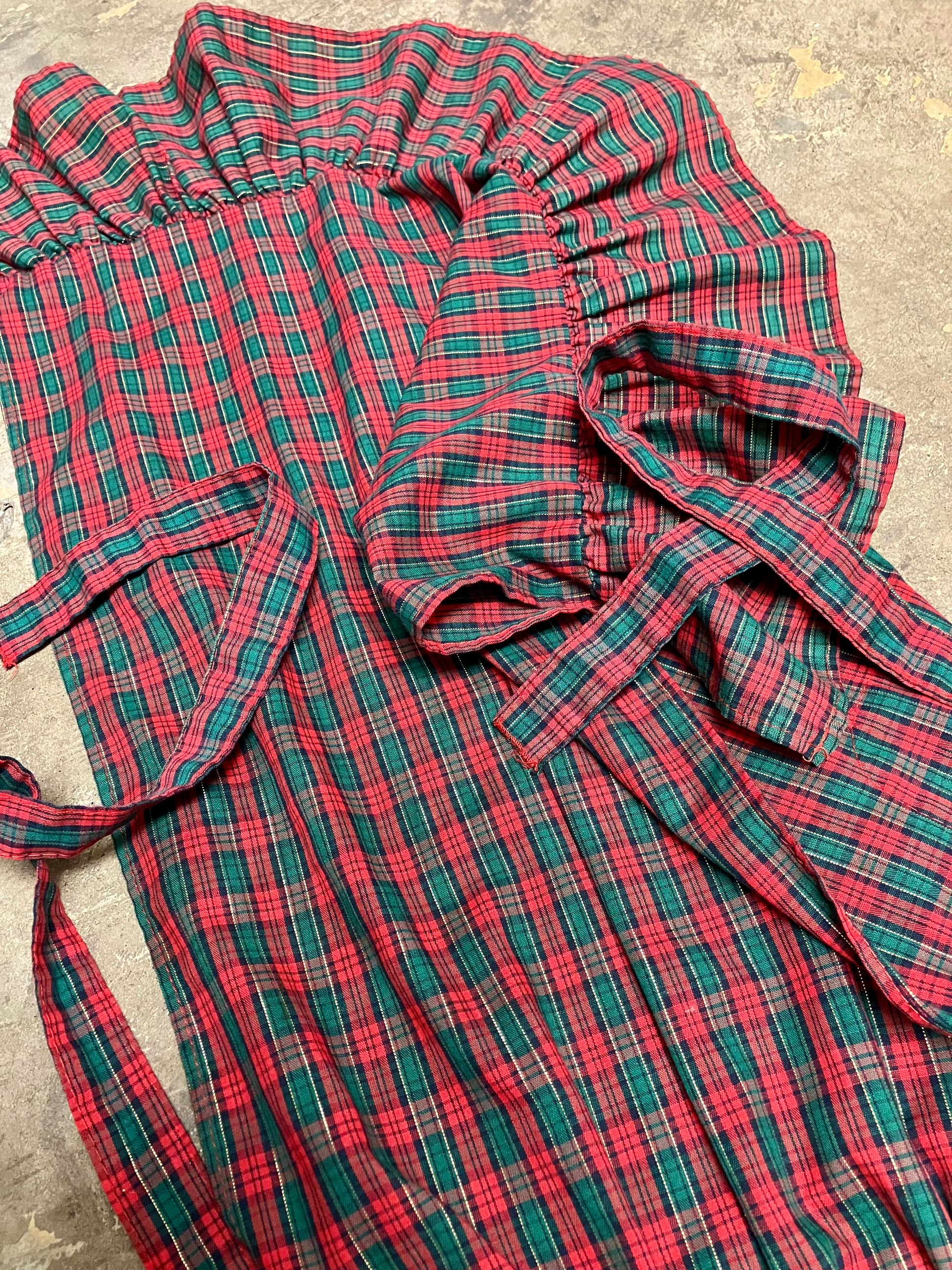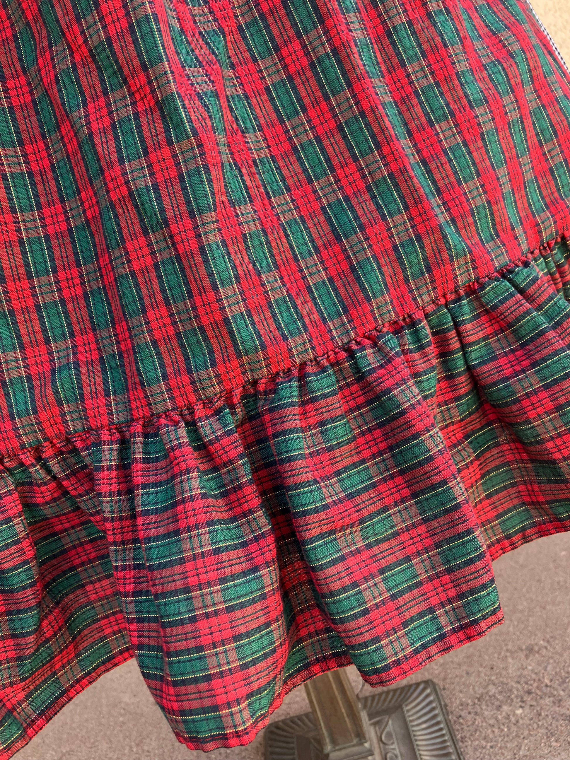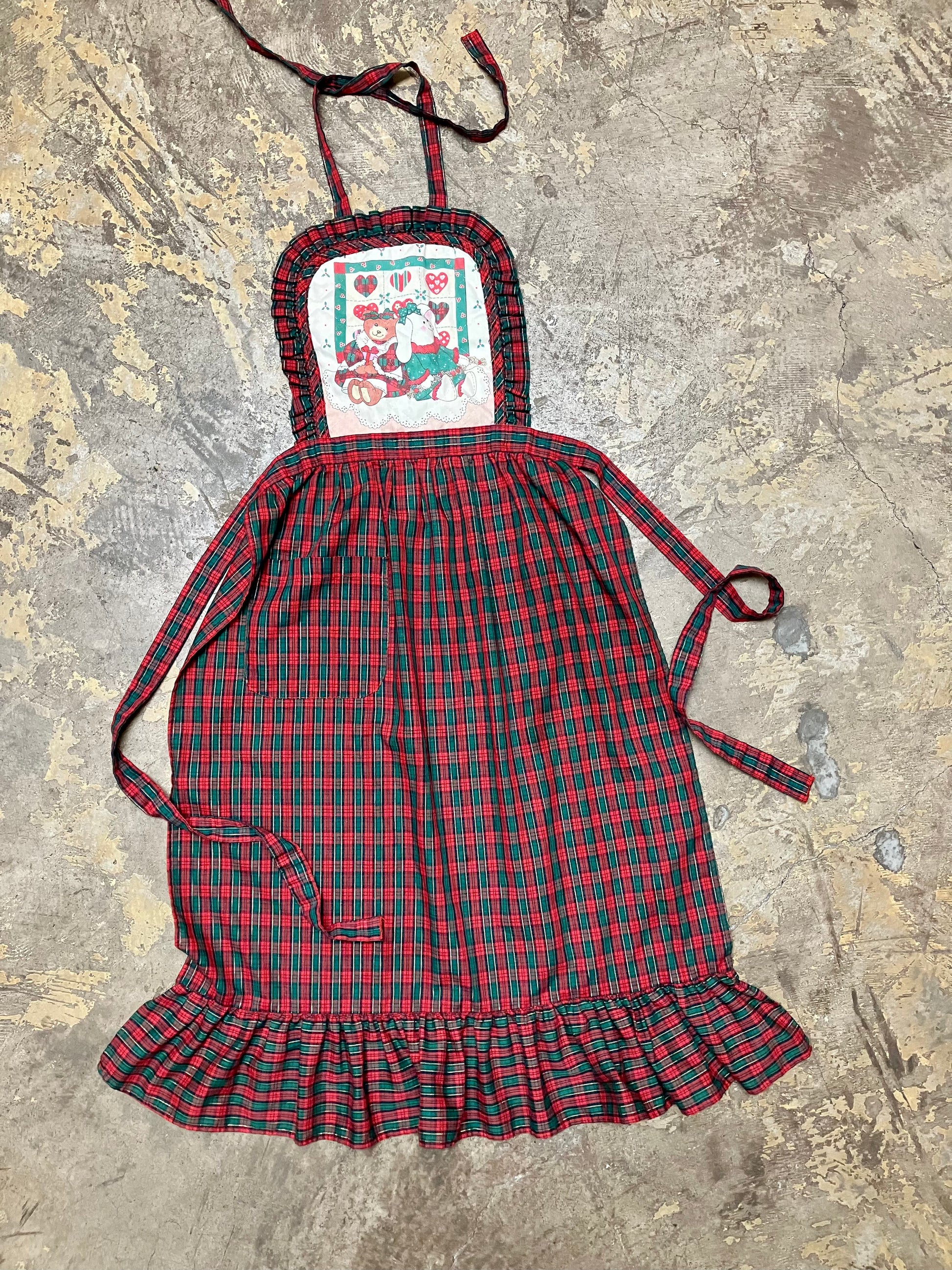 Have a Beary Merry Christmas this season baking in this beauty. This epic 80's apron is adorned with an adorable bear and bunny all ready for the season. Pinafore style with neck and waist ties along with a single pocket. Bib. has a quilted look and RUFFLES! Rich red and green plaid with hints of gold have us hearing the Christmas tunes already