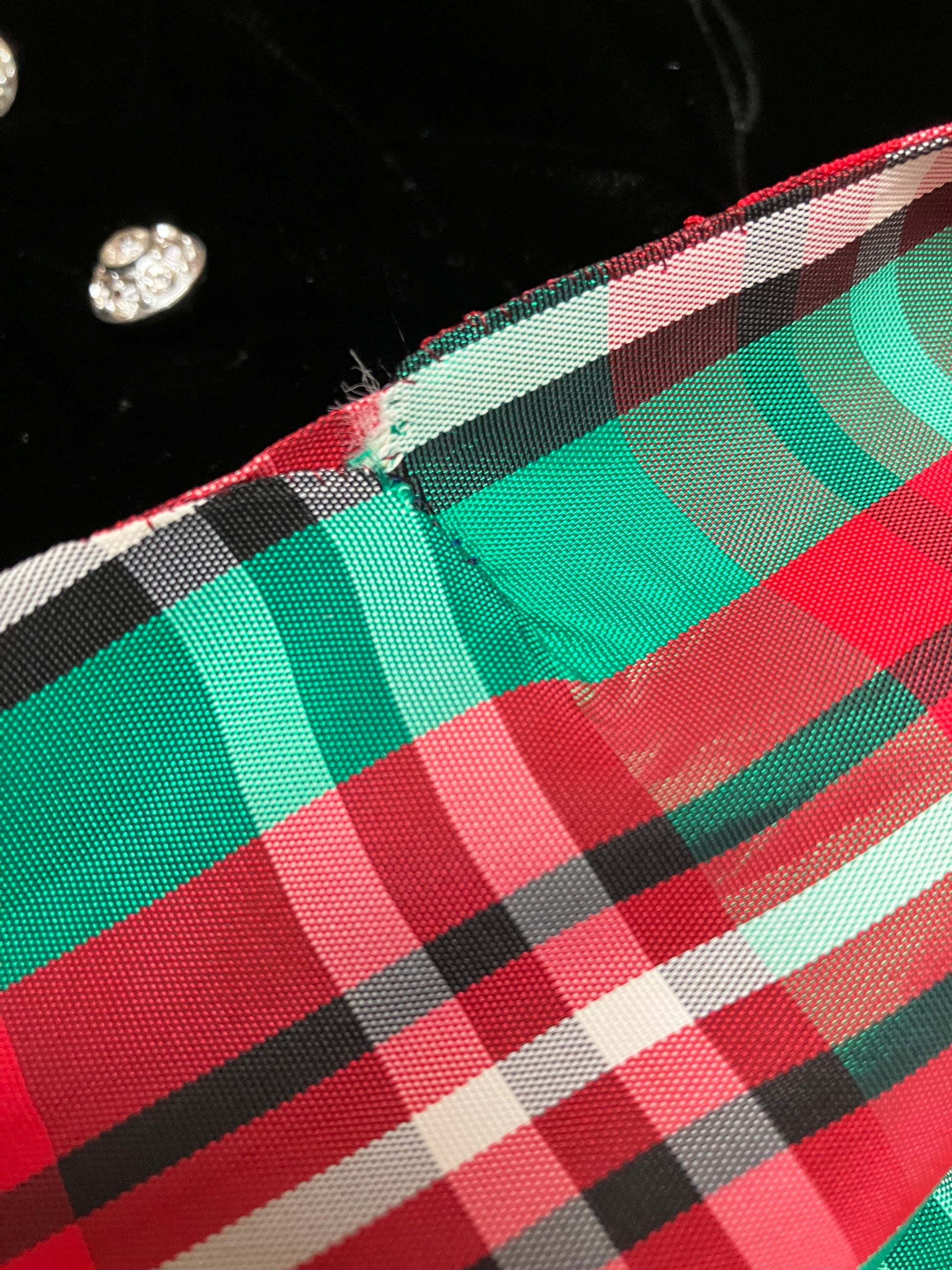 Features a fitted bodice with a square neck line in black velvet adorned with rhinestone buttons. Matching skirt and sash are a bold tartan plaid taffeta in festive colors of red and green with yellow, blue and white accents. The removeable sash offers a beautiful transition between the bodice and skirt with a prominent bow that offer cinching to the silhouette for a defined waistline. Sash can be tied in front or back of the dress according to your preference.