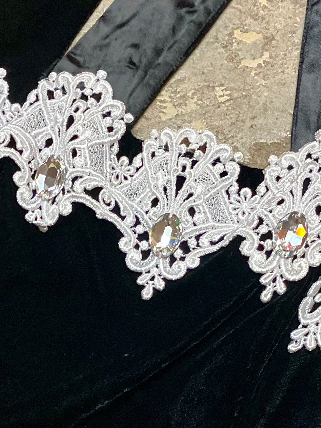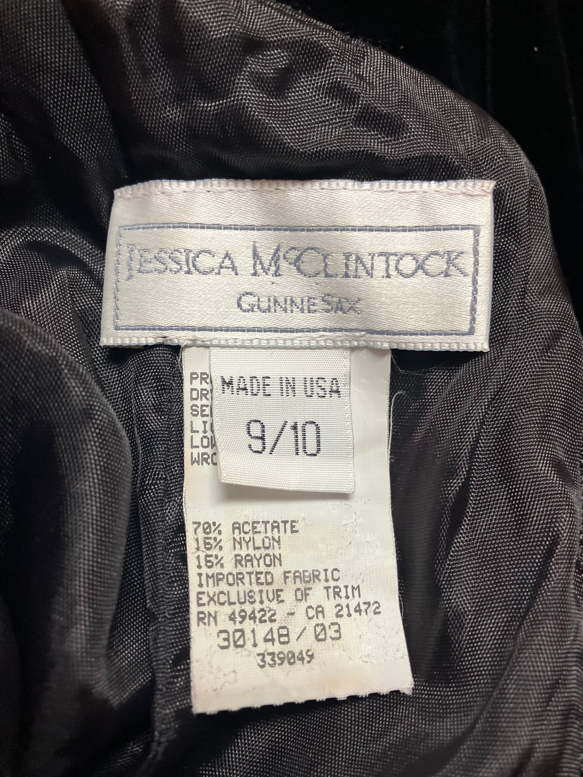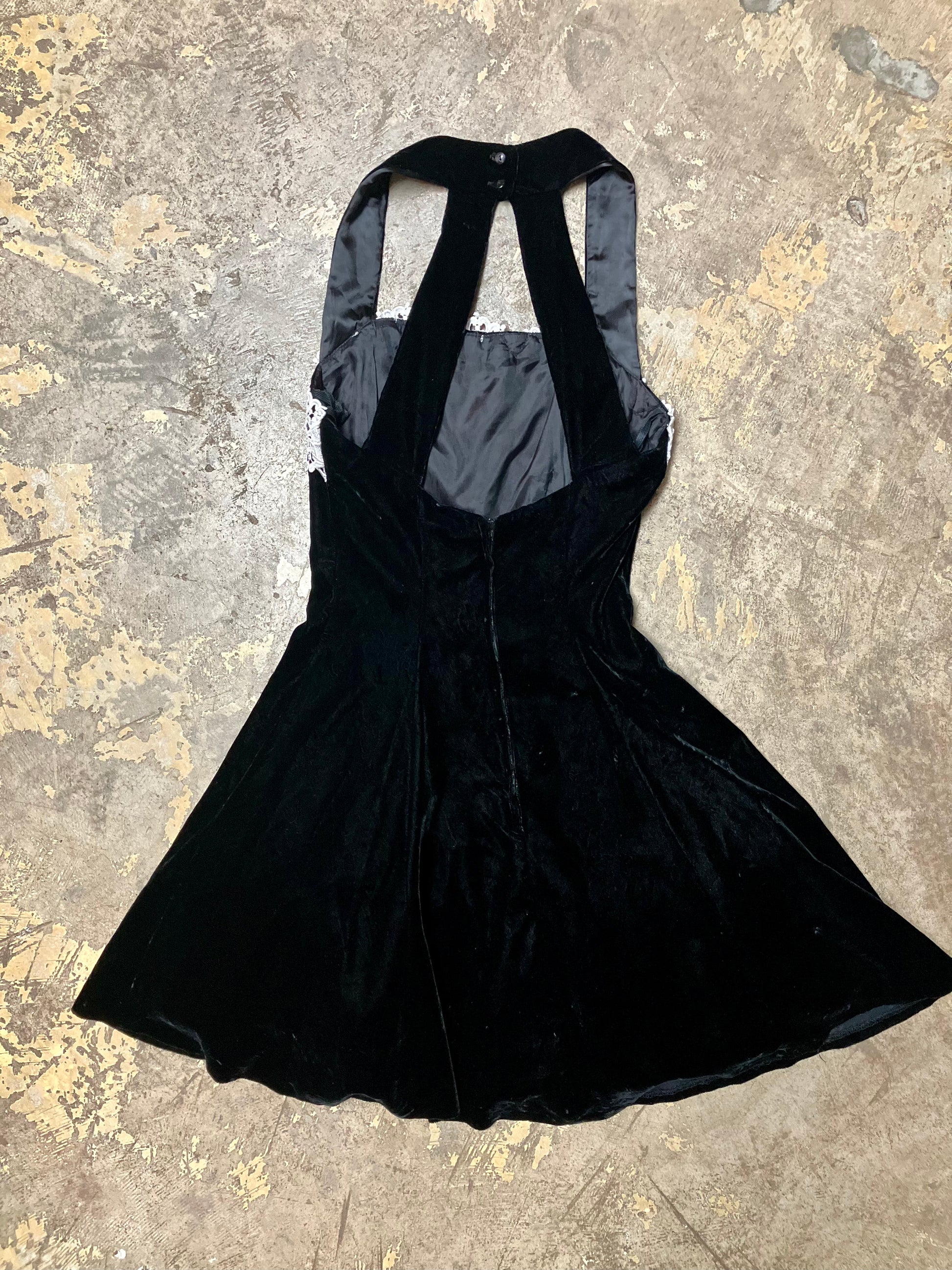 This dress...a classic piece that's a timeless addition to your wardrobe. A simple romantic elegance of lush black velvet paired with white lace and jewel accents is just the charm we love from Jessica McClintock. This 90's cocktail dress offers a fit-and-flare silhouette with a fitted bodice and flared short skirt. We're all about the halter neckline with an open back, giving a bit of sass and a bit of class all in one.