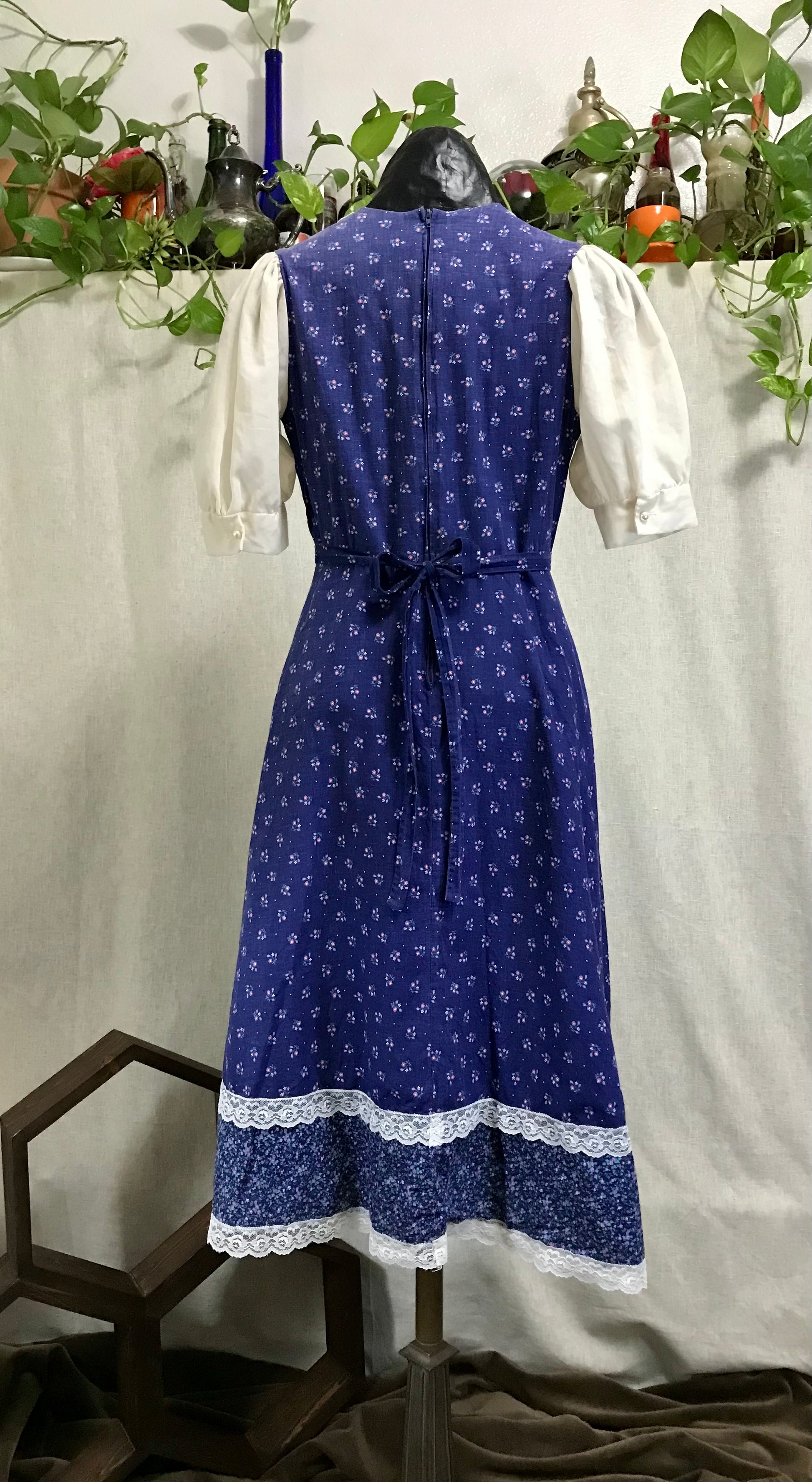 This cottagecore prairie dress is just darling! Adorable sleeves, a pearl button front bodice and a simple back tie accent bring this beauty to life. Oh and that lace trim and, let's not forget that dainty lace collar. Beautiful blue floral print fabrics...well golly...it's all of the details that made us fall for this cutie.