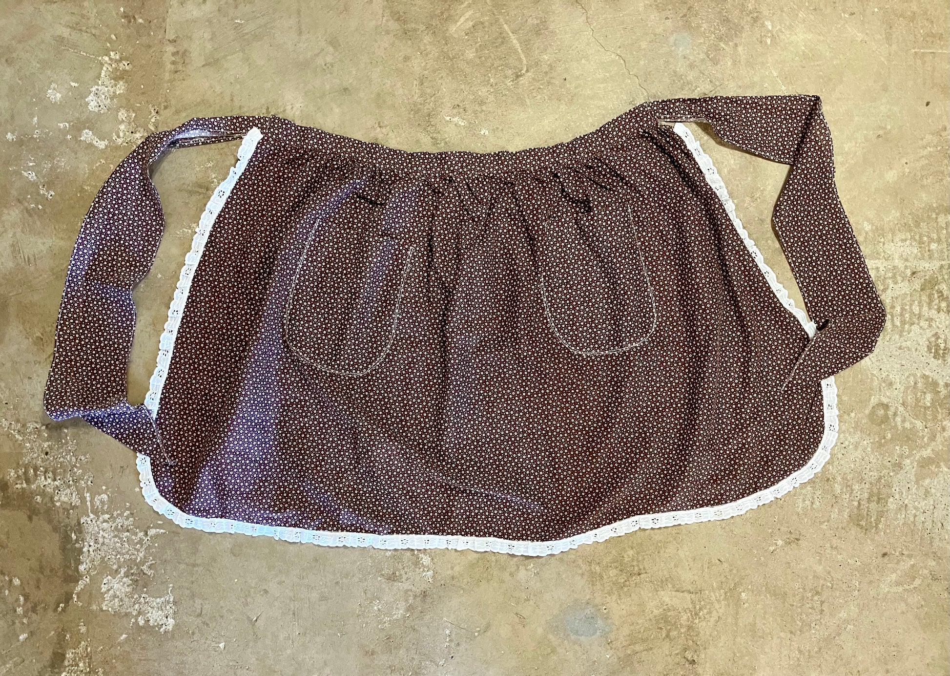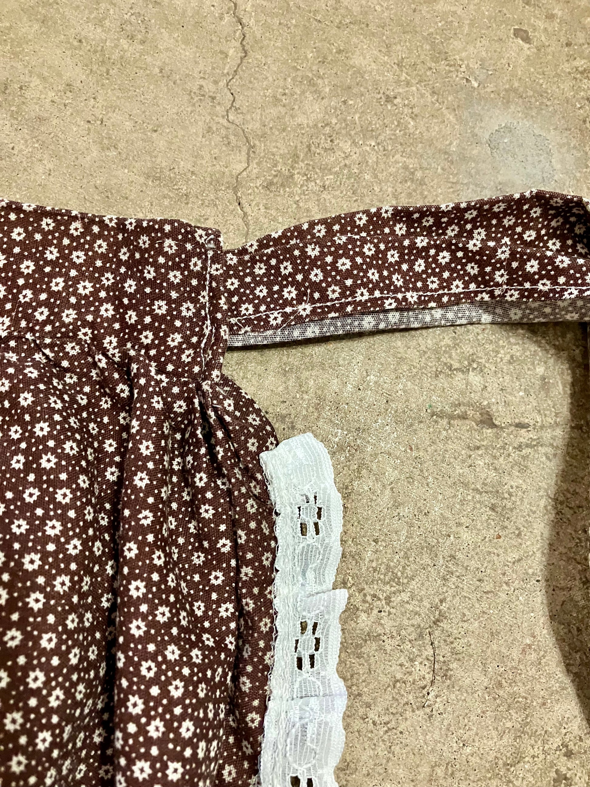 This handmade cutie has us craving a brown betty! A double pocket waist apron in a brown and white ditzy floral print with eyelet trim. We adore the wide waist ties that create a beautiful back bow!