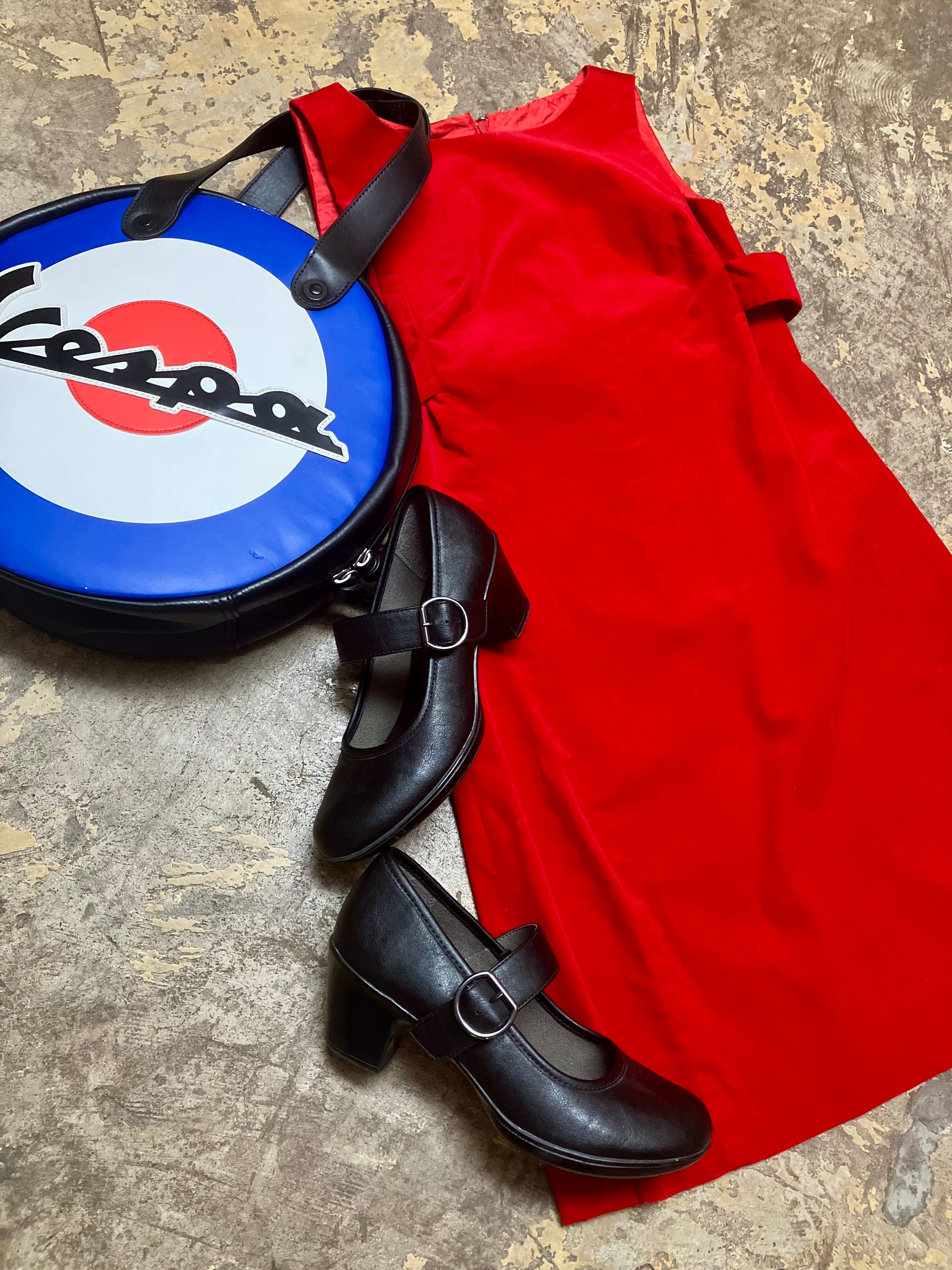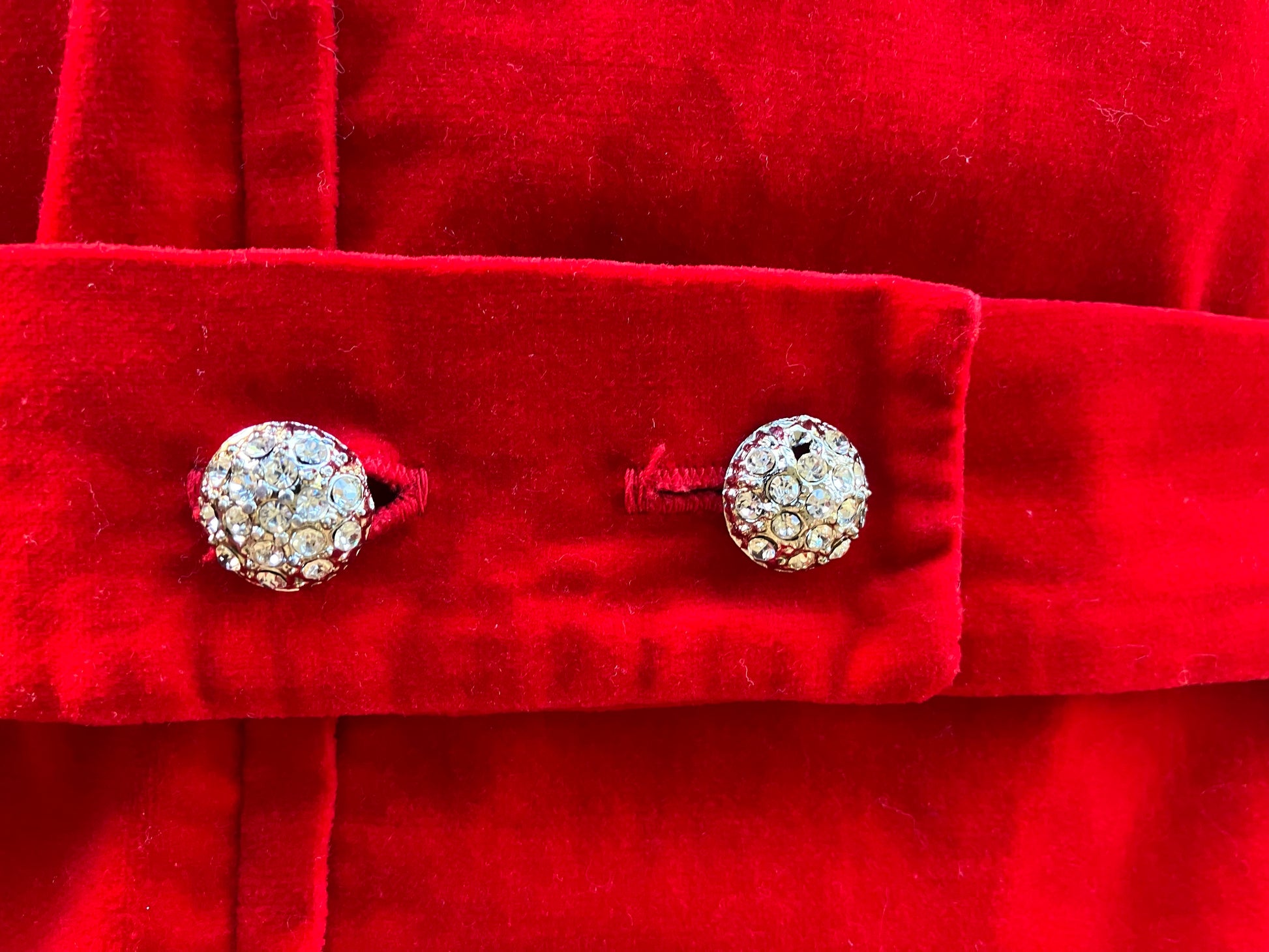 Pop into that 1960's mod look flaunting this brilliant red velvet shift dress by Candy Jrs. Sleeveless midi dress with jeweled button back bodice accent. A simple yet stunning piece.
