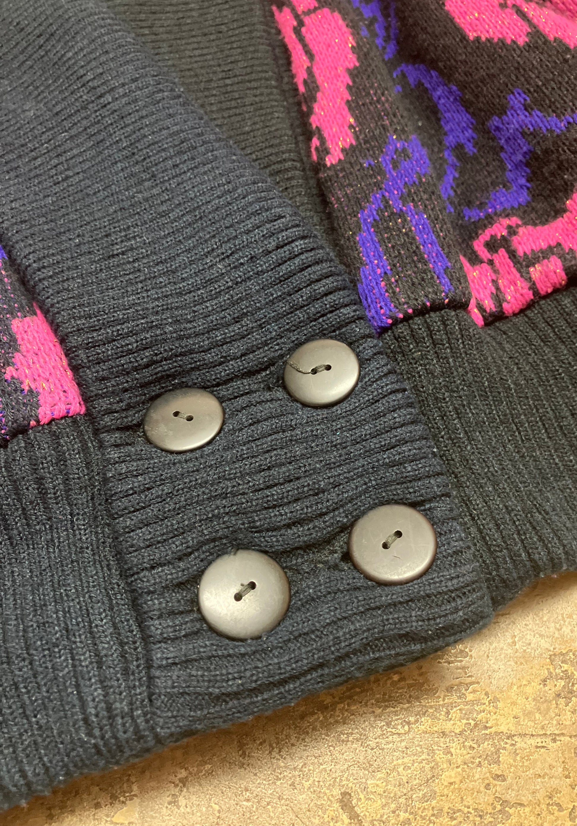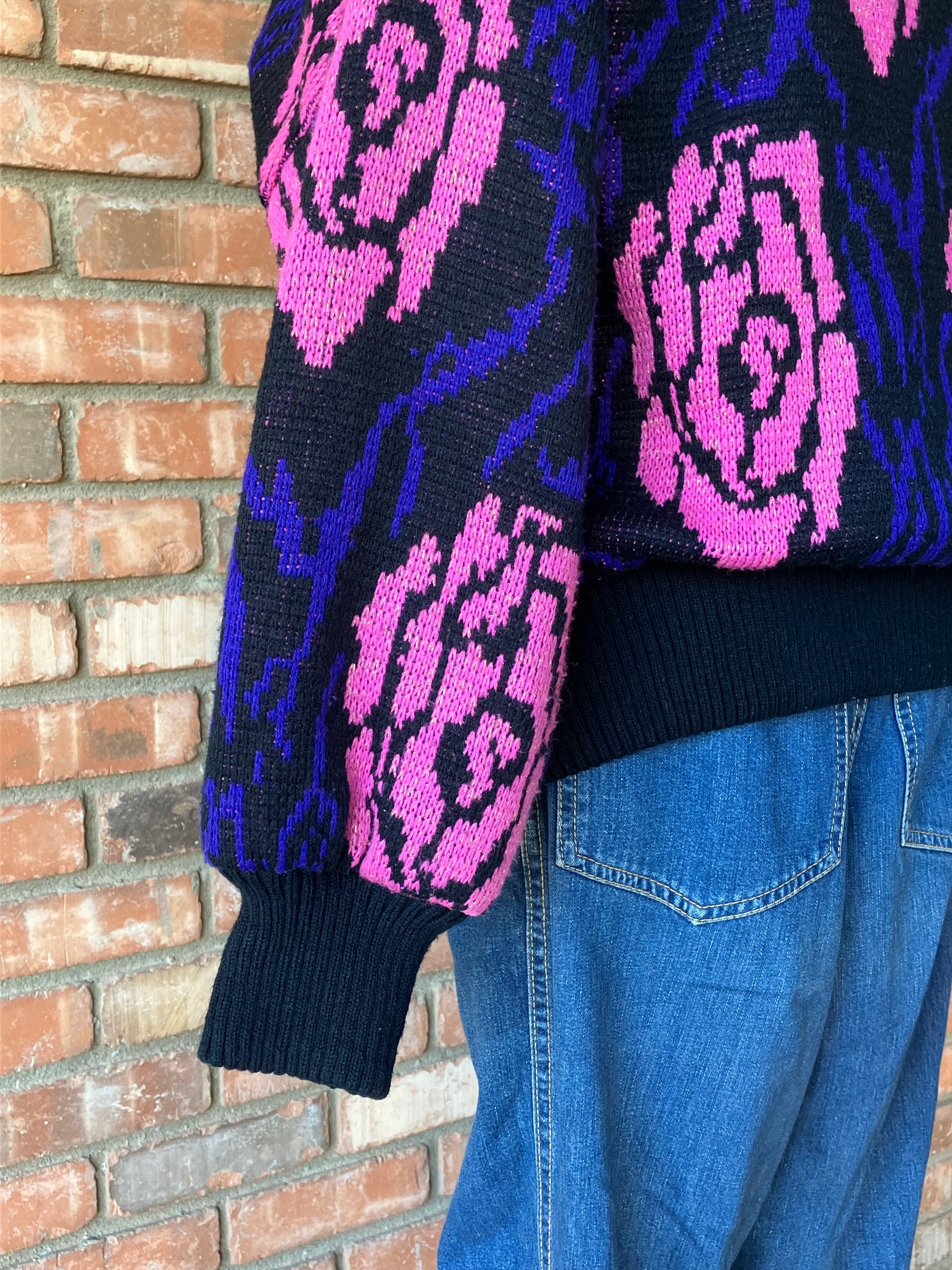 This cardigan features a vibrant floral knit pattern of large pink roses with a purple vines on a black background. Material has a metallic shimmer throughout.