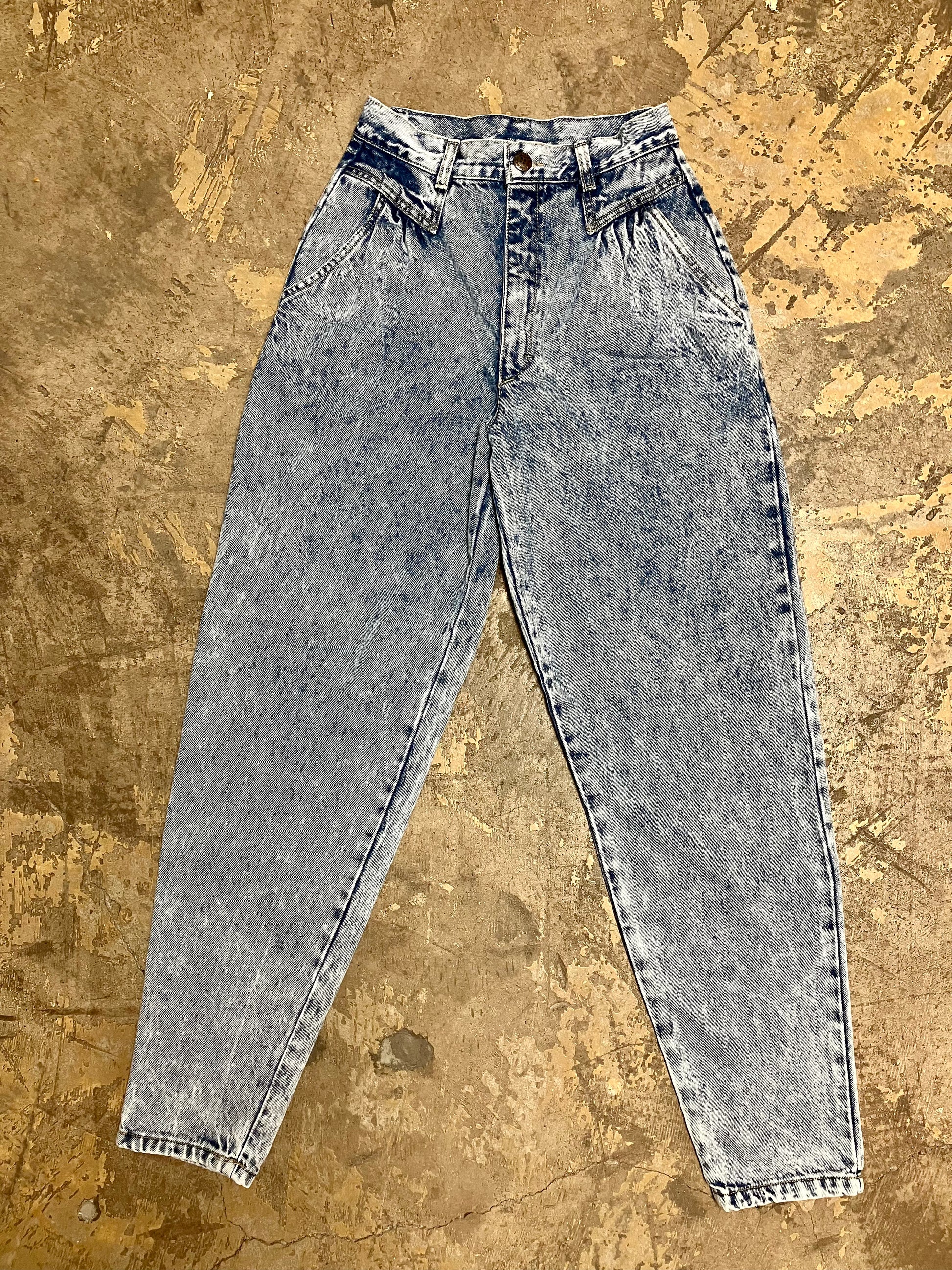 Features front pockets with pleat accents, tapered leg and high waist with that incredible acid wash denim.