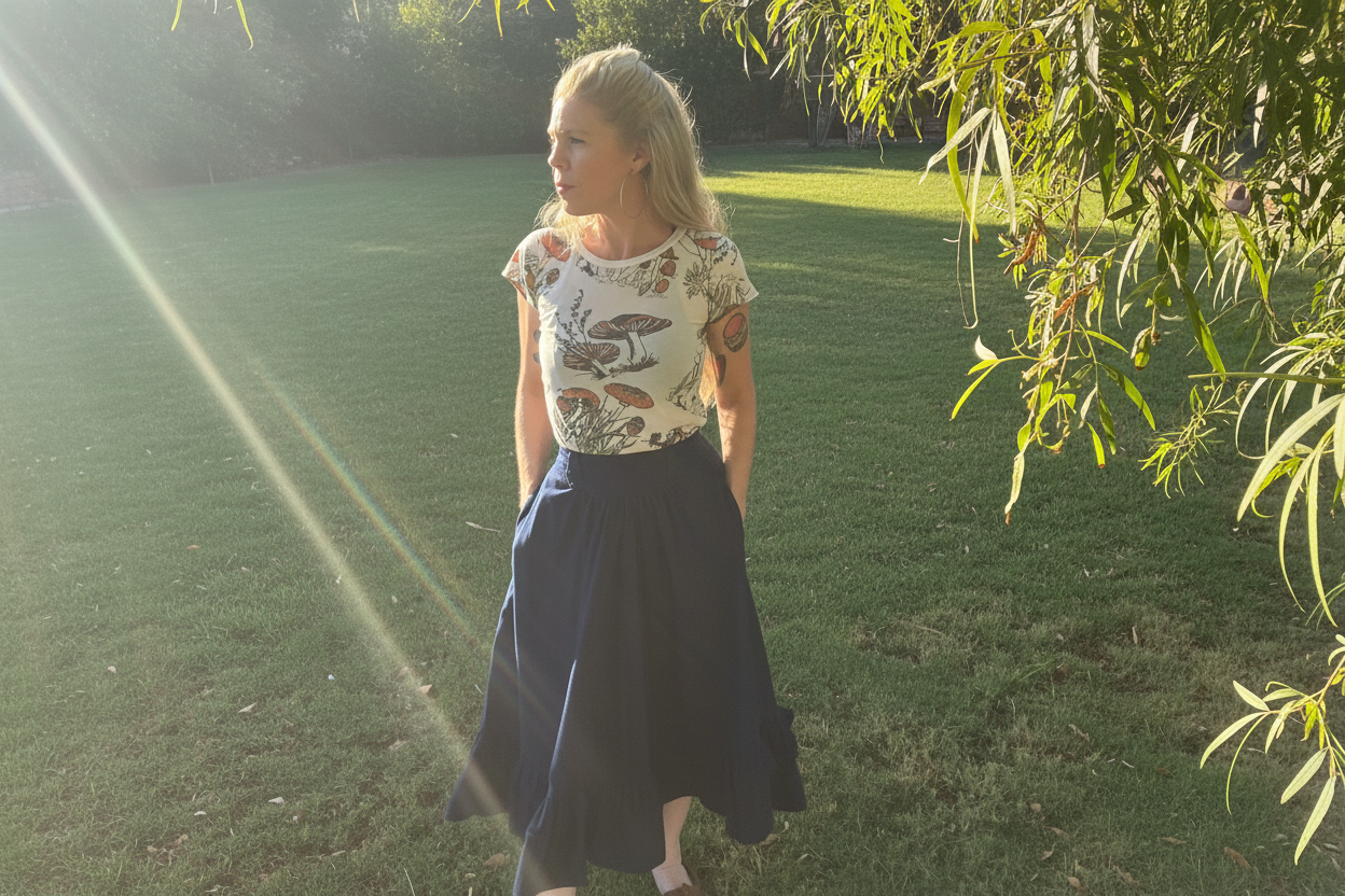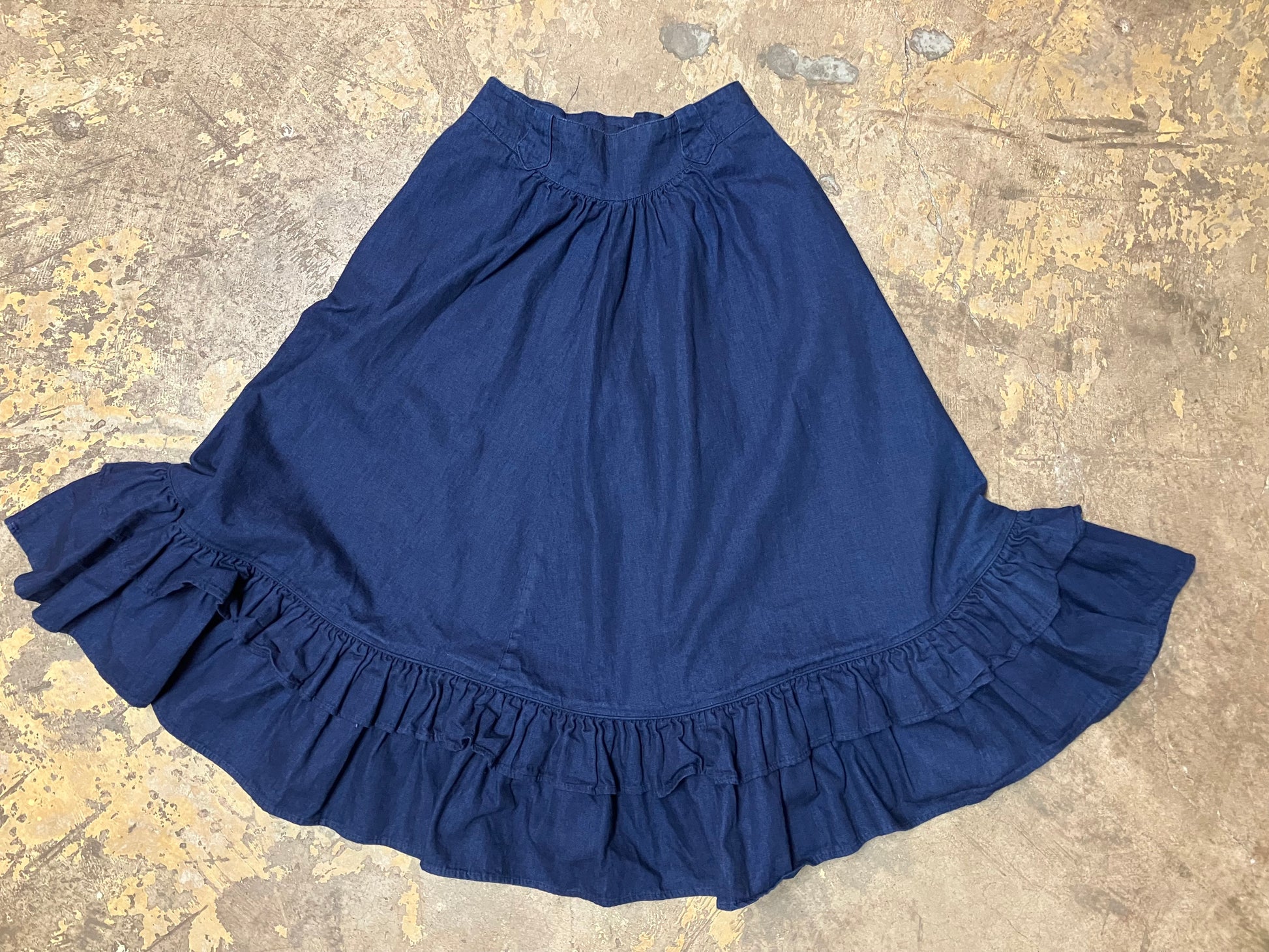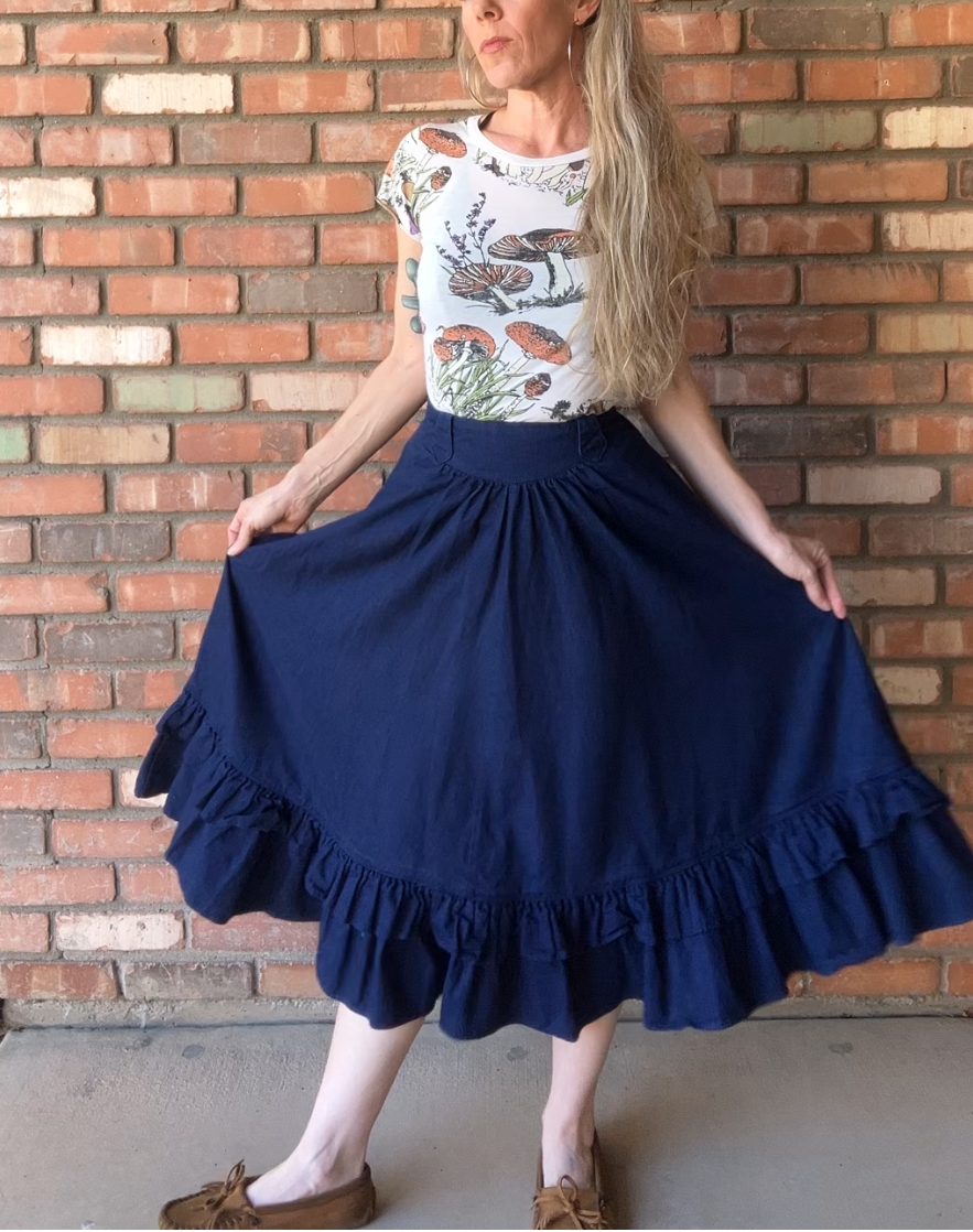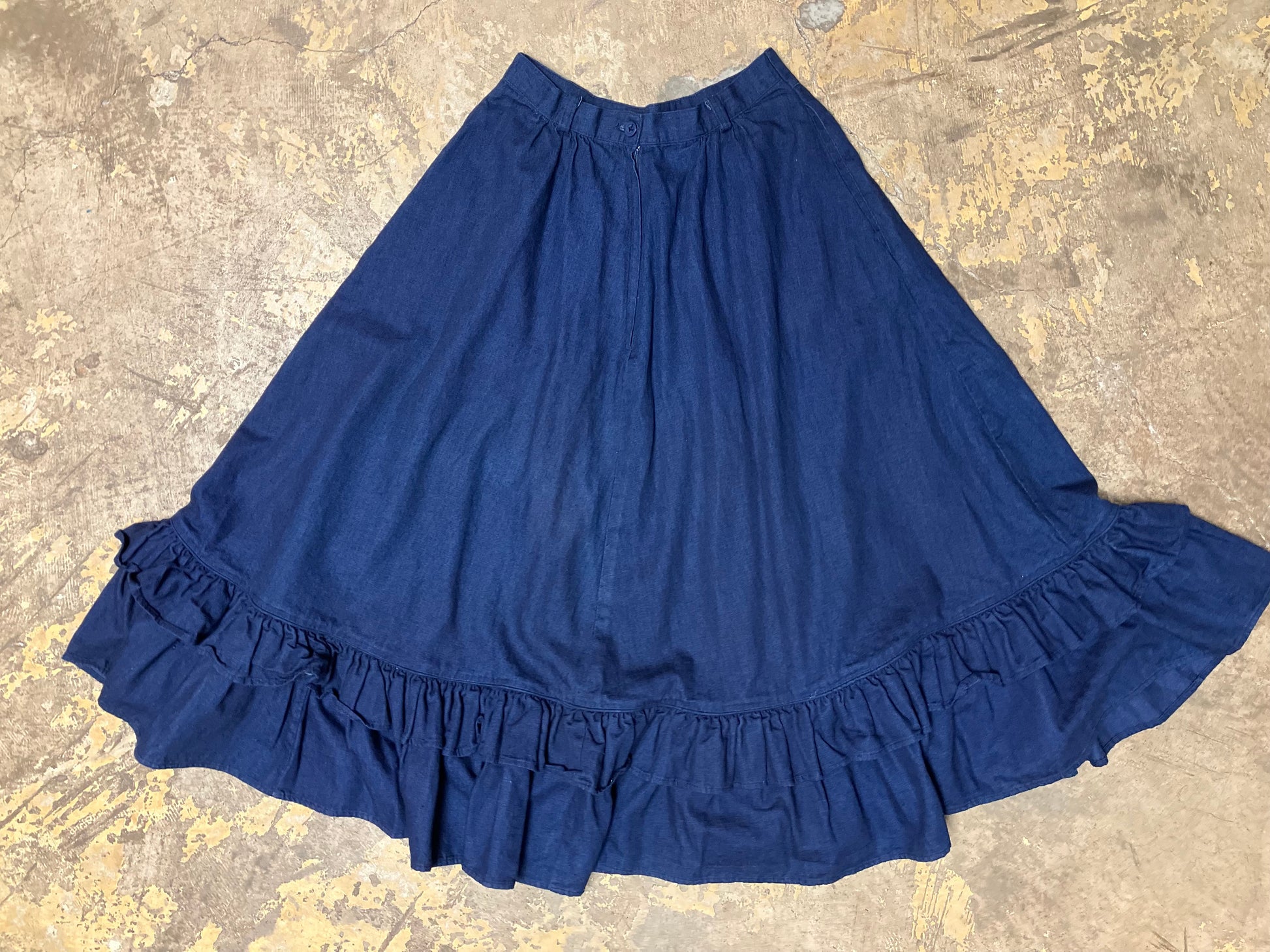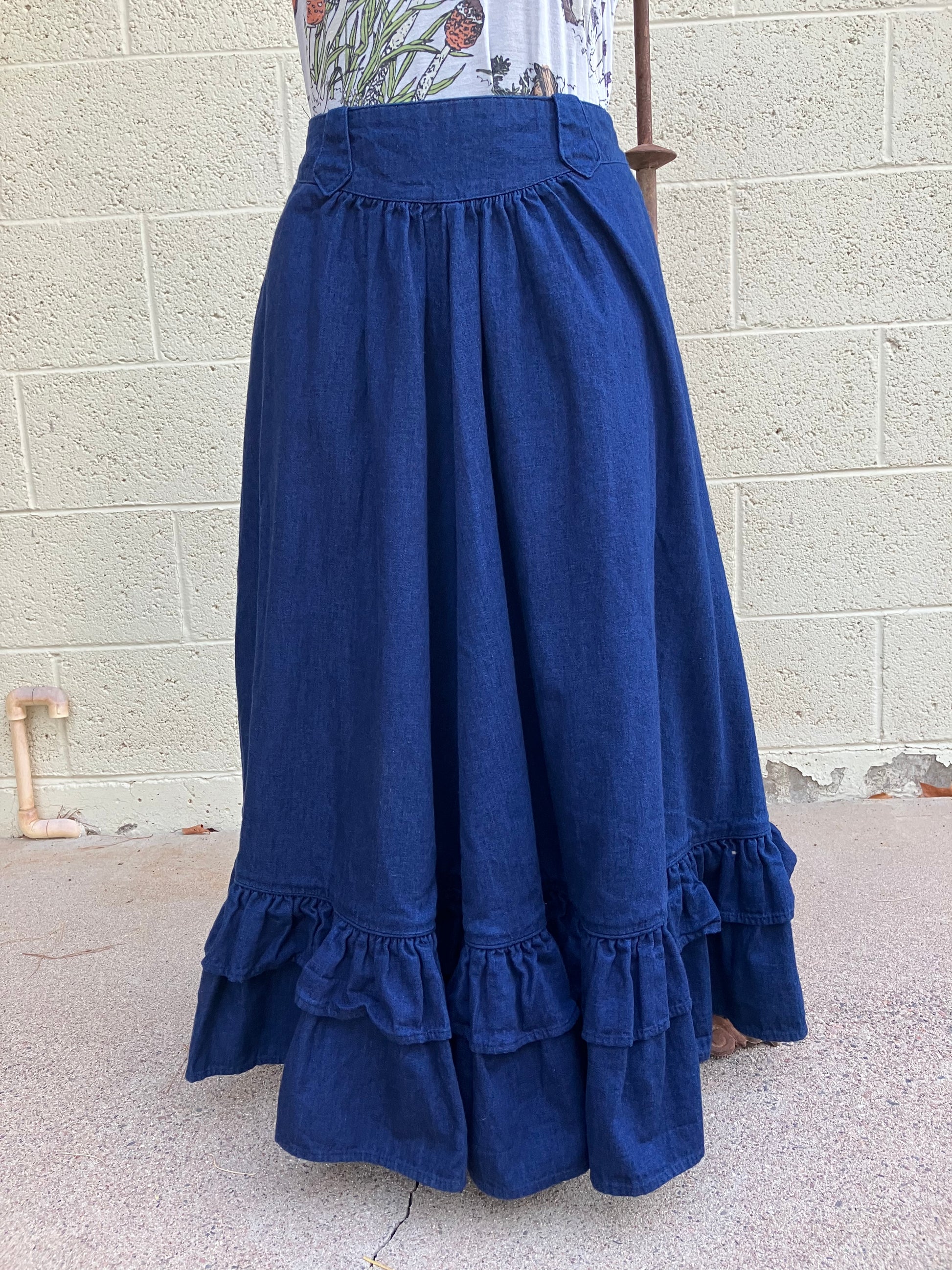 Giddy up buttercup! This darling skirt won't stick around long. This dark denim prairie/western midi skirt is a perfect staple piece for any cottagecore or western inspired wardrobe. Offers inseam side pockets, a ruffled hem and a huge sweep.
