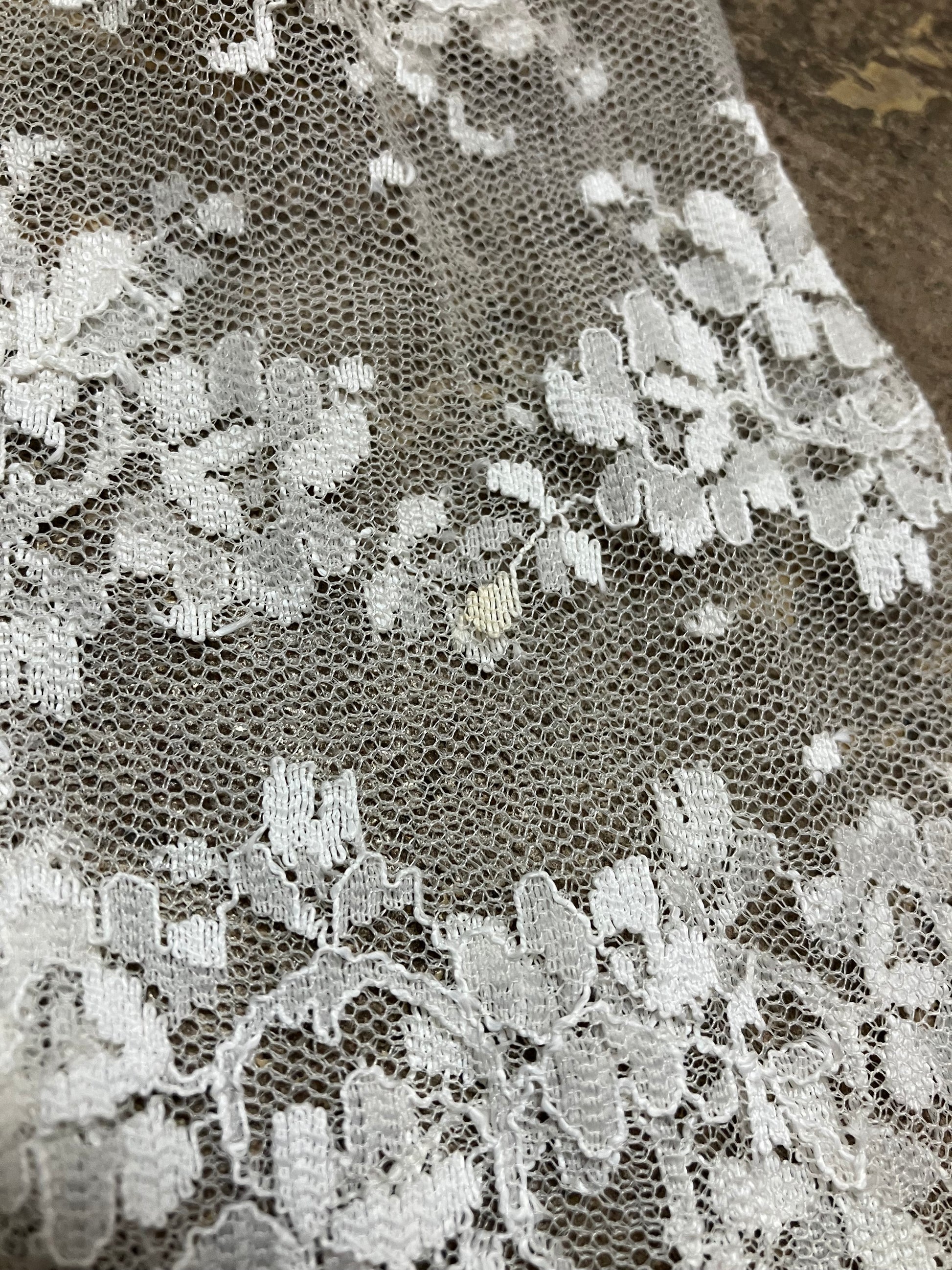 Dress is in overall good condition. There are two small stains noted in photos. One just below armpit on front right. The second is at elbow area of back of left sleeve. There is also a thin run in the lace down front of dress to right side. All flaws are faint and hard to see once the garment is on.