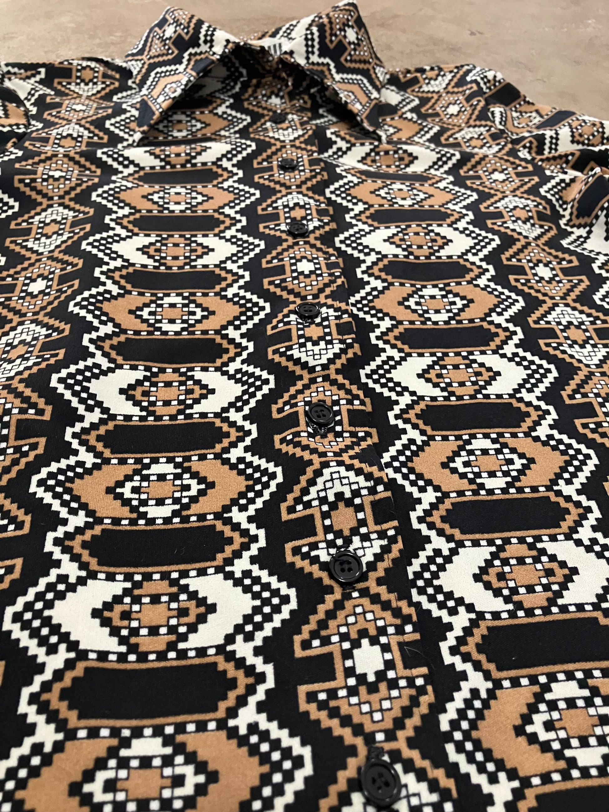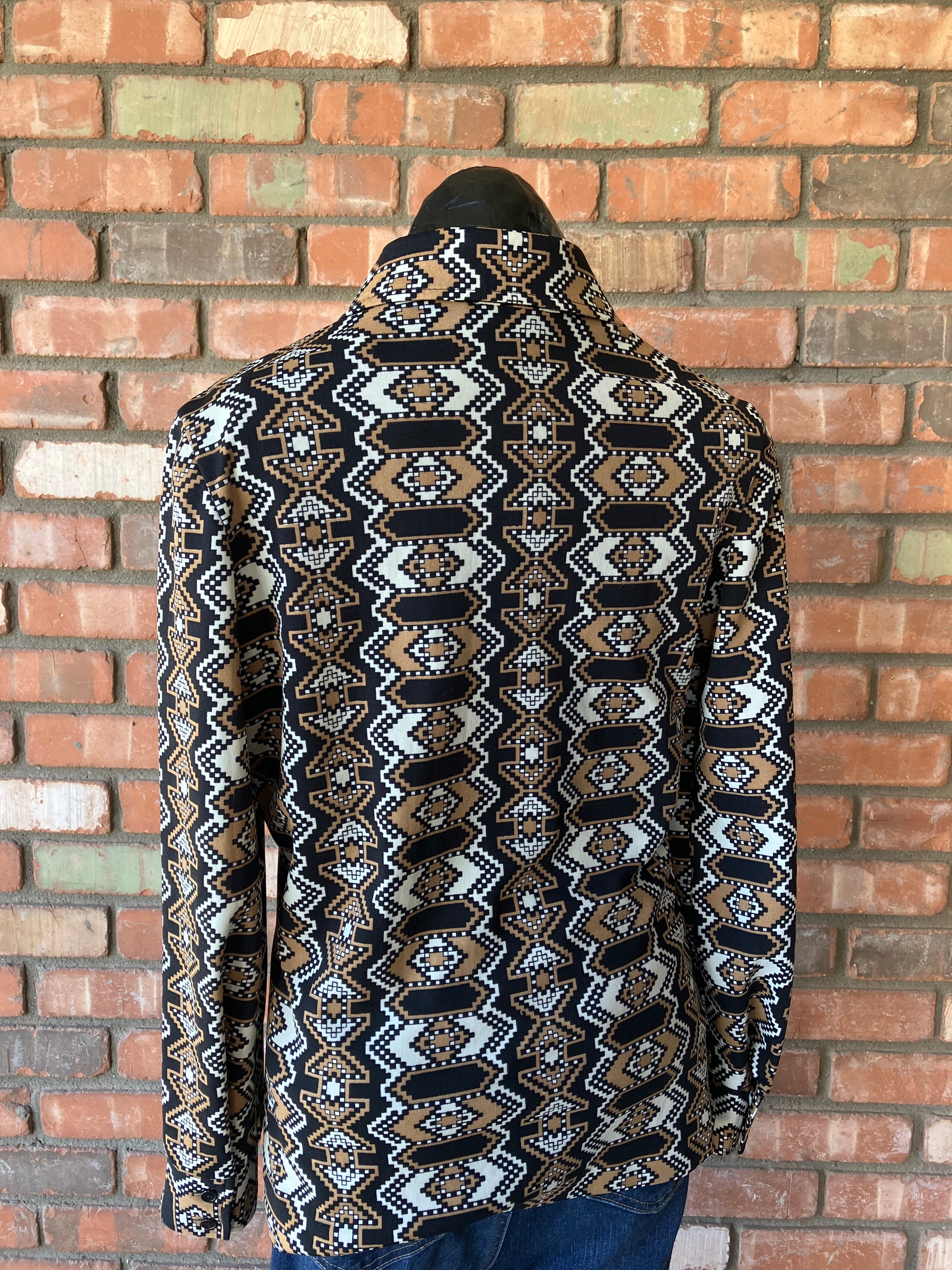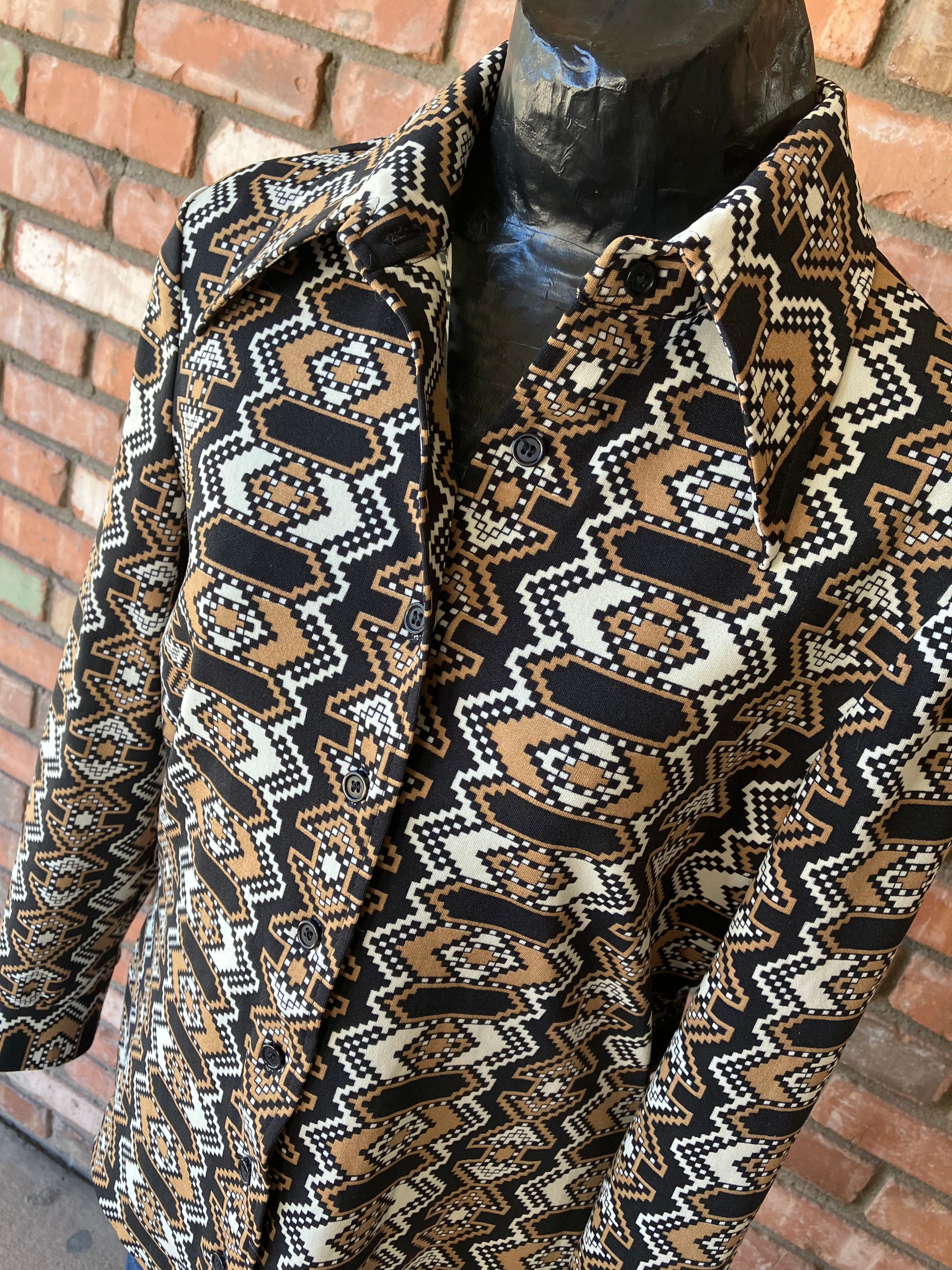 We're loving the funky geometric southwestern flare print of this 70's ACT III button down! Donning a color pallet of tan, black and white along with black buttons...what's not to love?