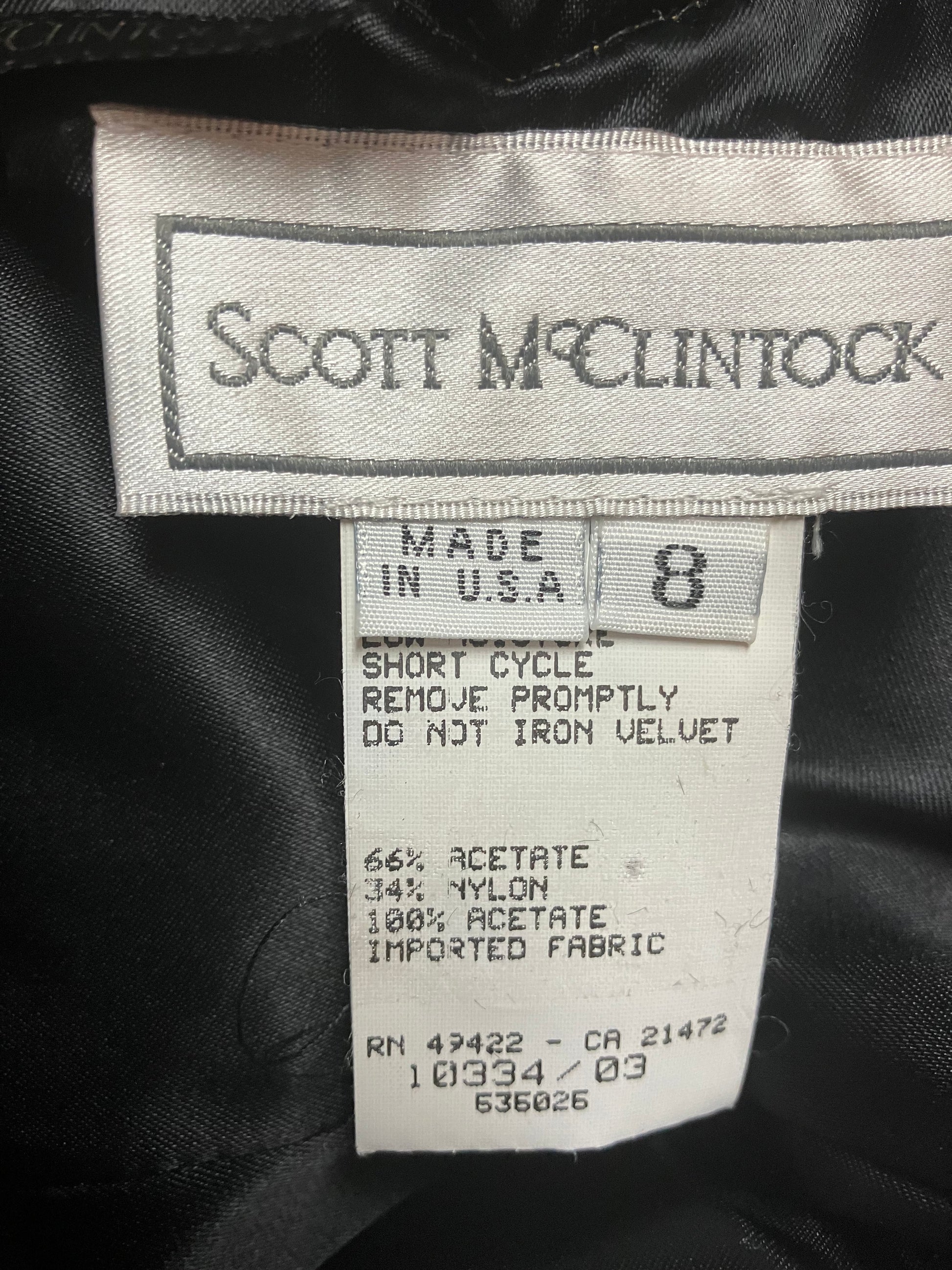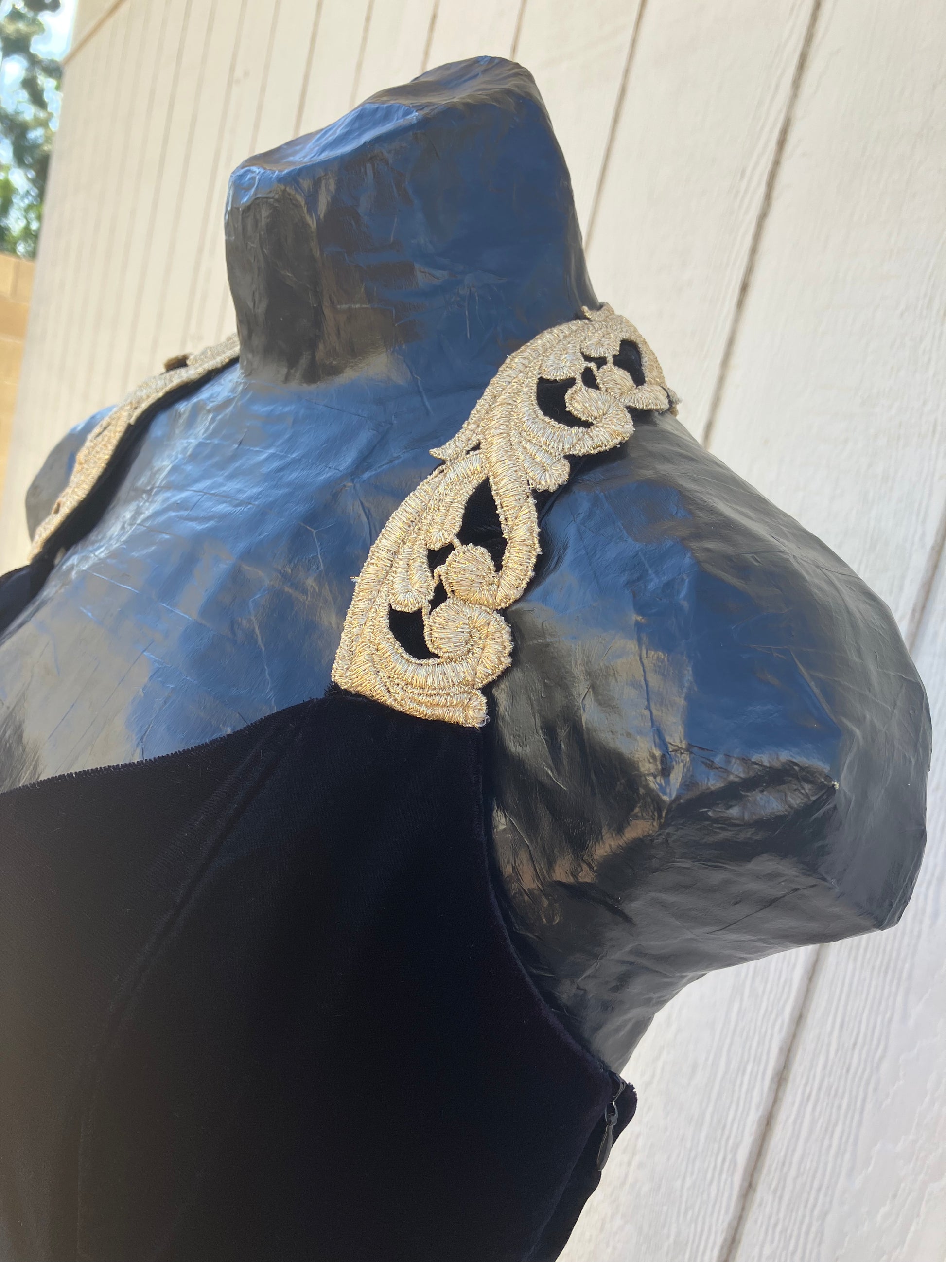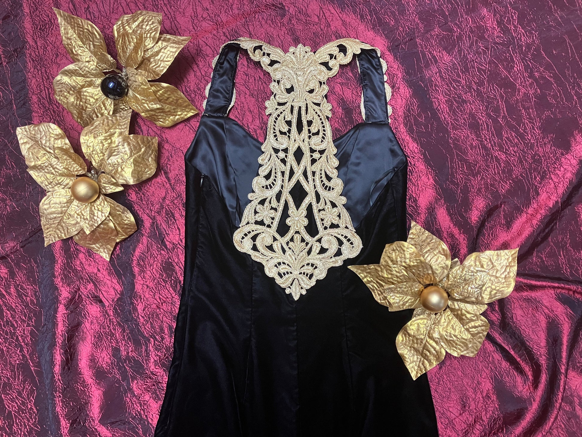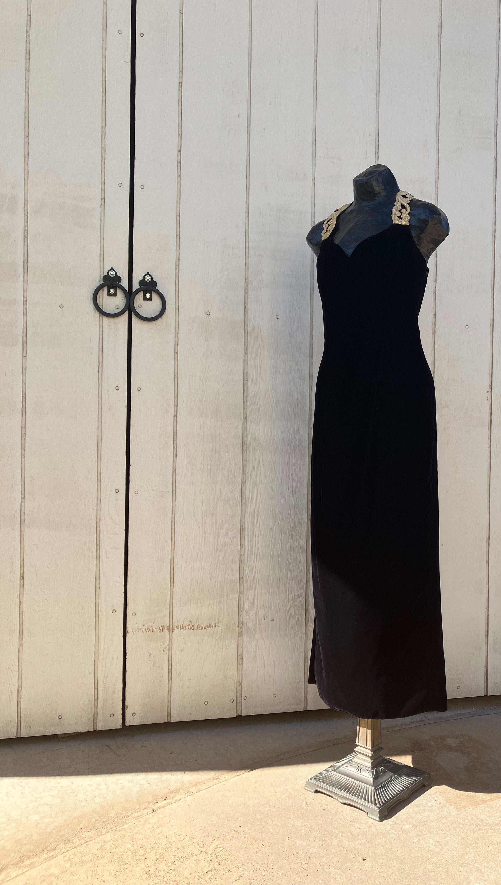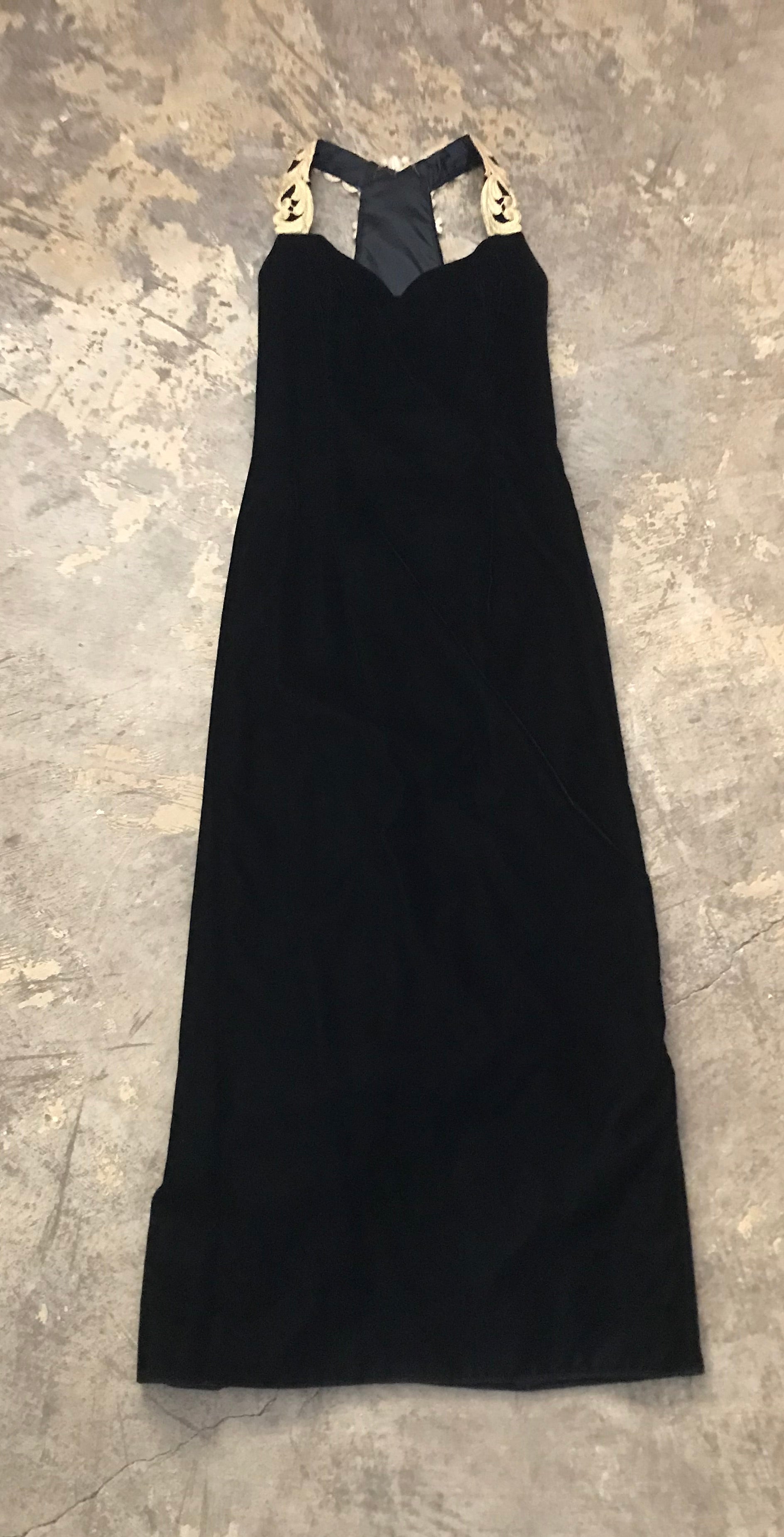 Get glam in this gorgeous black velvet and gold lace maxi gown by Scott McClintock. This stunning 90's gown features a striking, ornate gold lace brocade racerback sleeveless design complimented with a form fitting sheath silhouette. Gown also offers a flare at lower back hem for ease of movement.