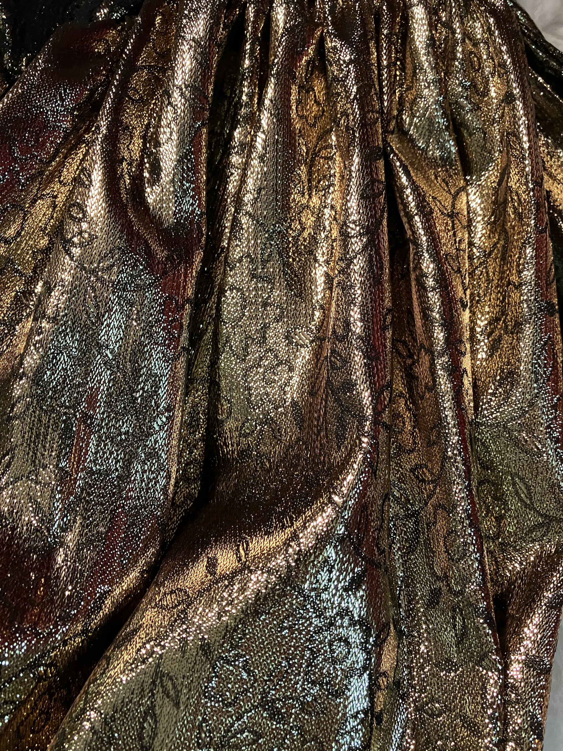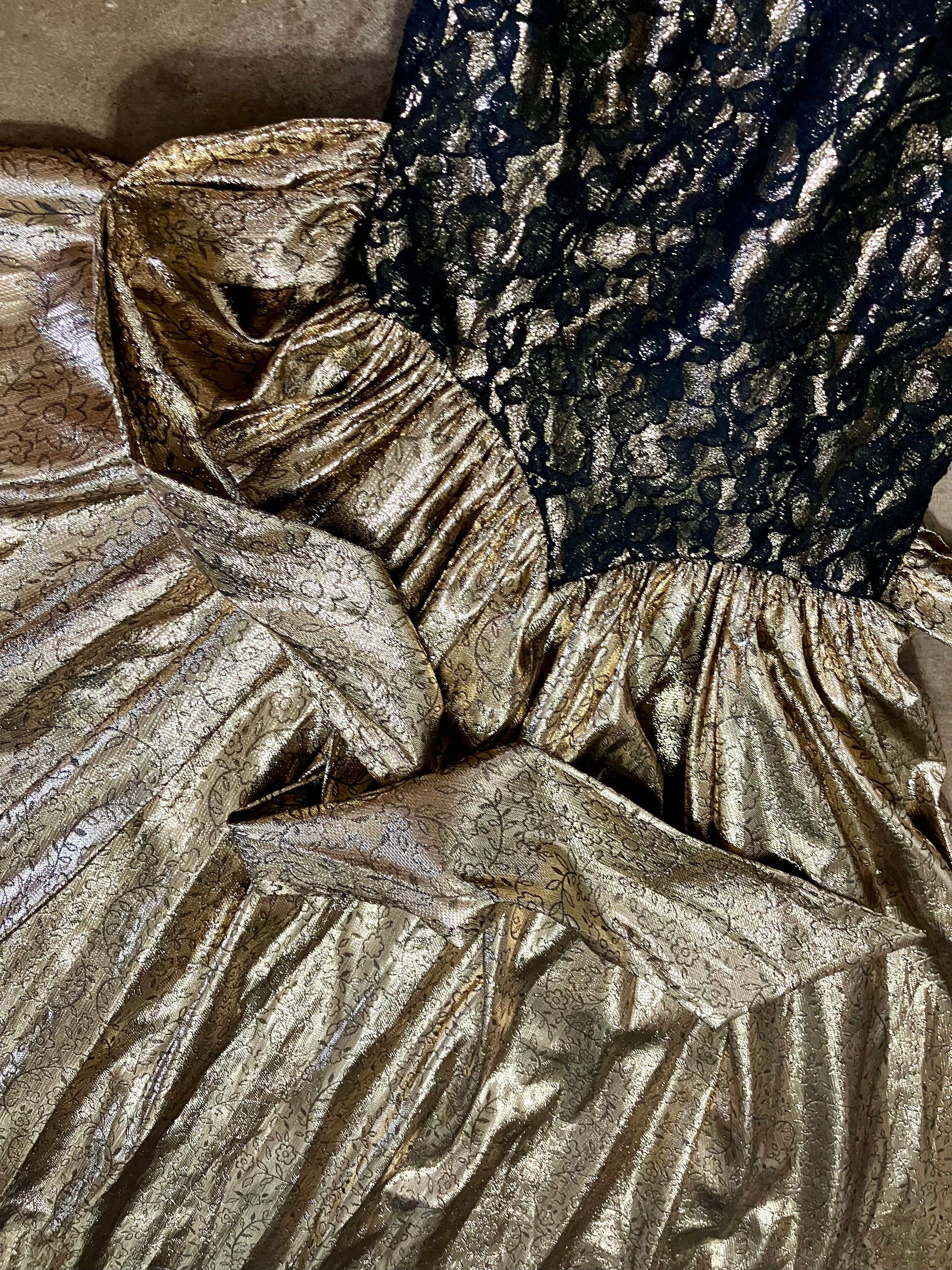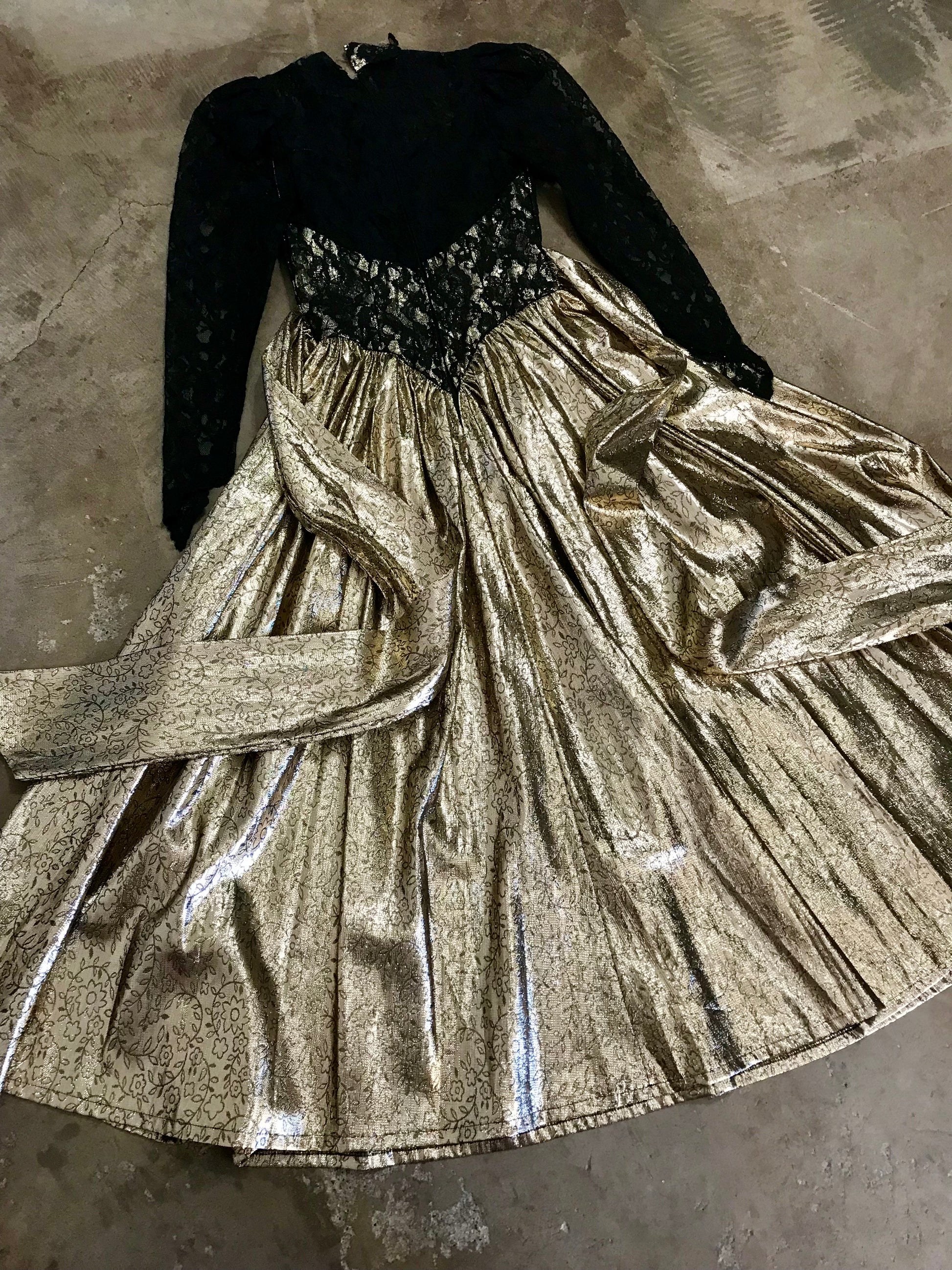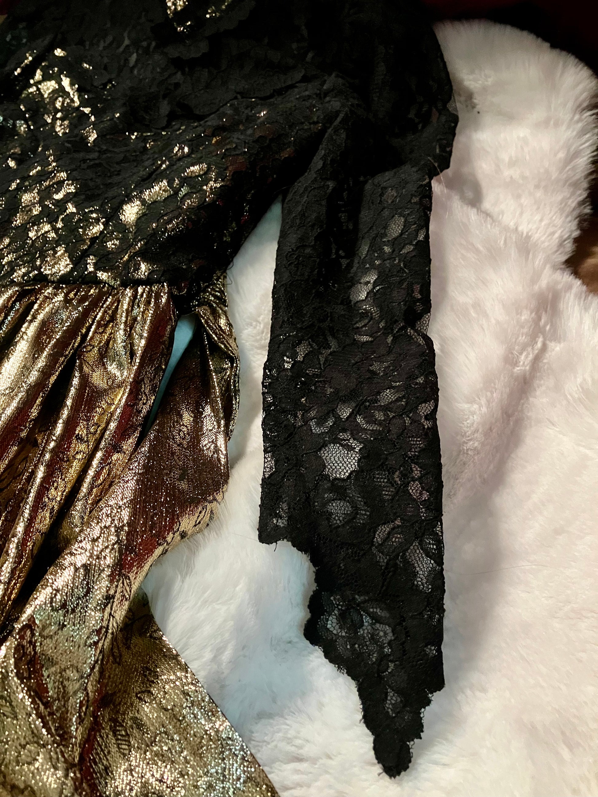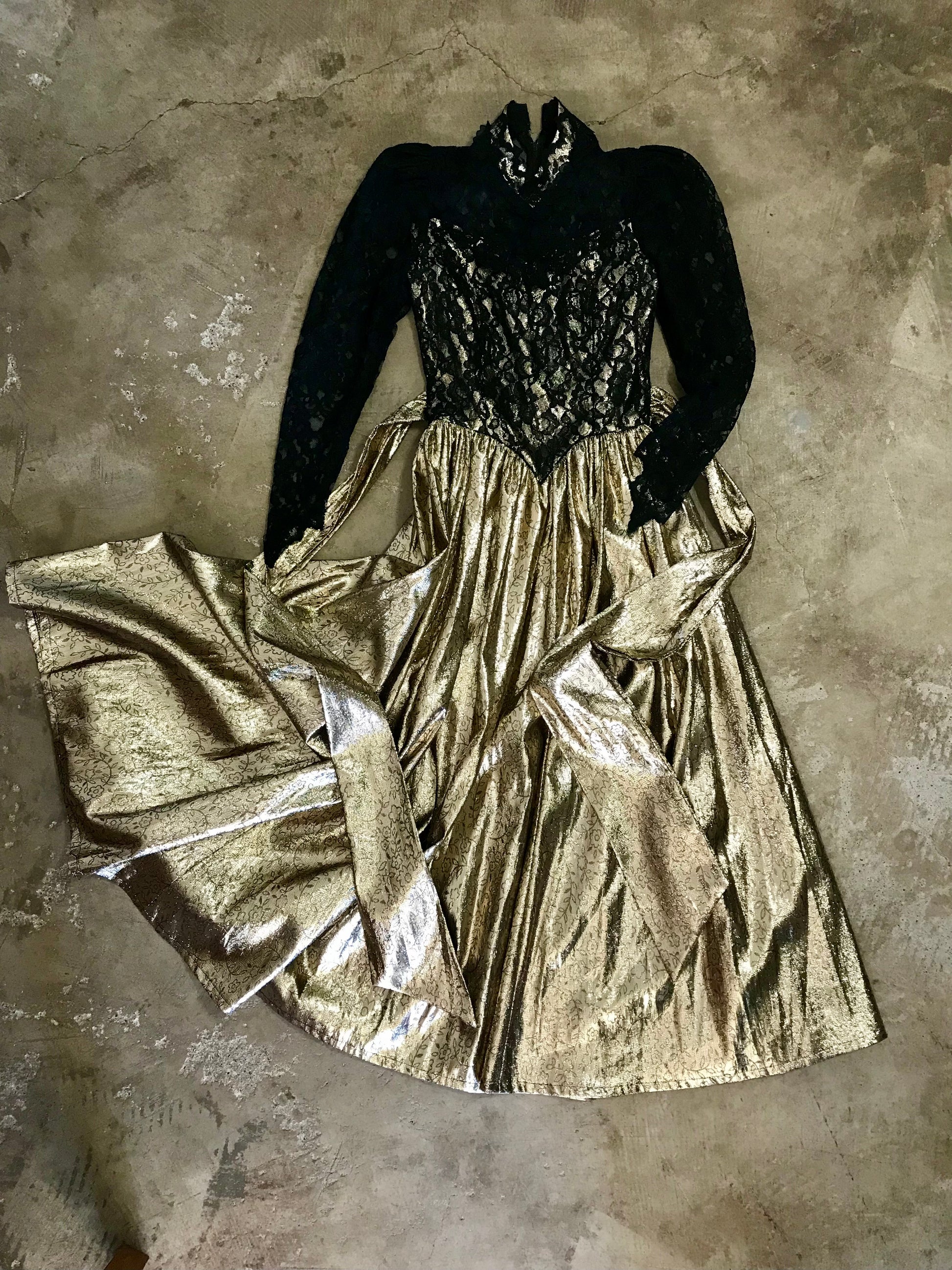 This gothic gown is SOOO epically 80's! Beautiful combination of gold fabric and black lace for the win! This maxi has a high collar lace neck, 3/4 lace sleaves, oversized ties for back bow accent and a huge sweep.