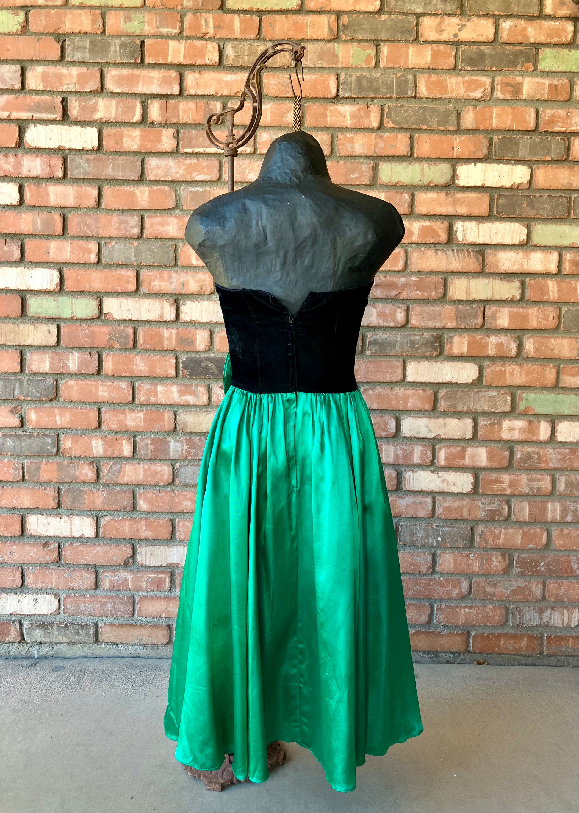 This spectacular strapless number features a dramatic sweetheart neckline in a rich black velvet bodice and a flowing emerald green satin skirt. Accented by a voluminous oversized bow and cascading draped layers at skirt front.