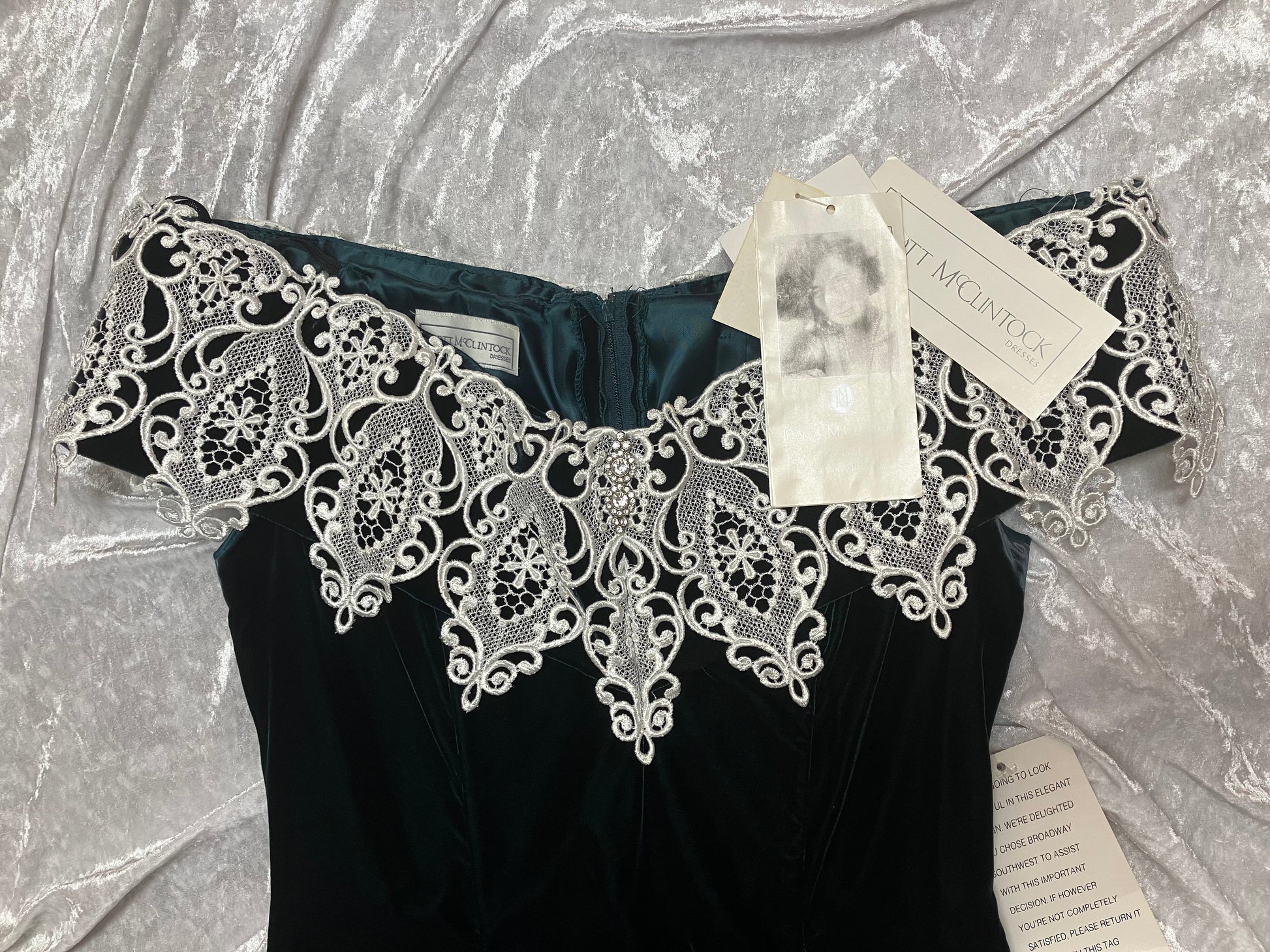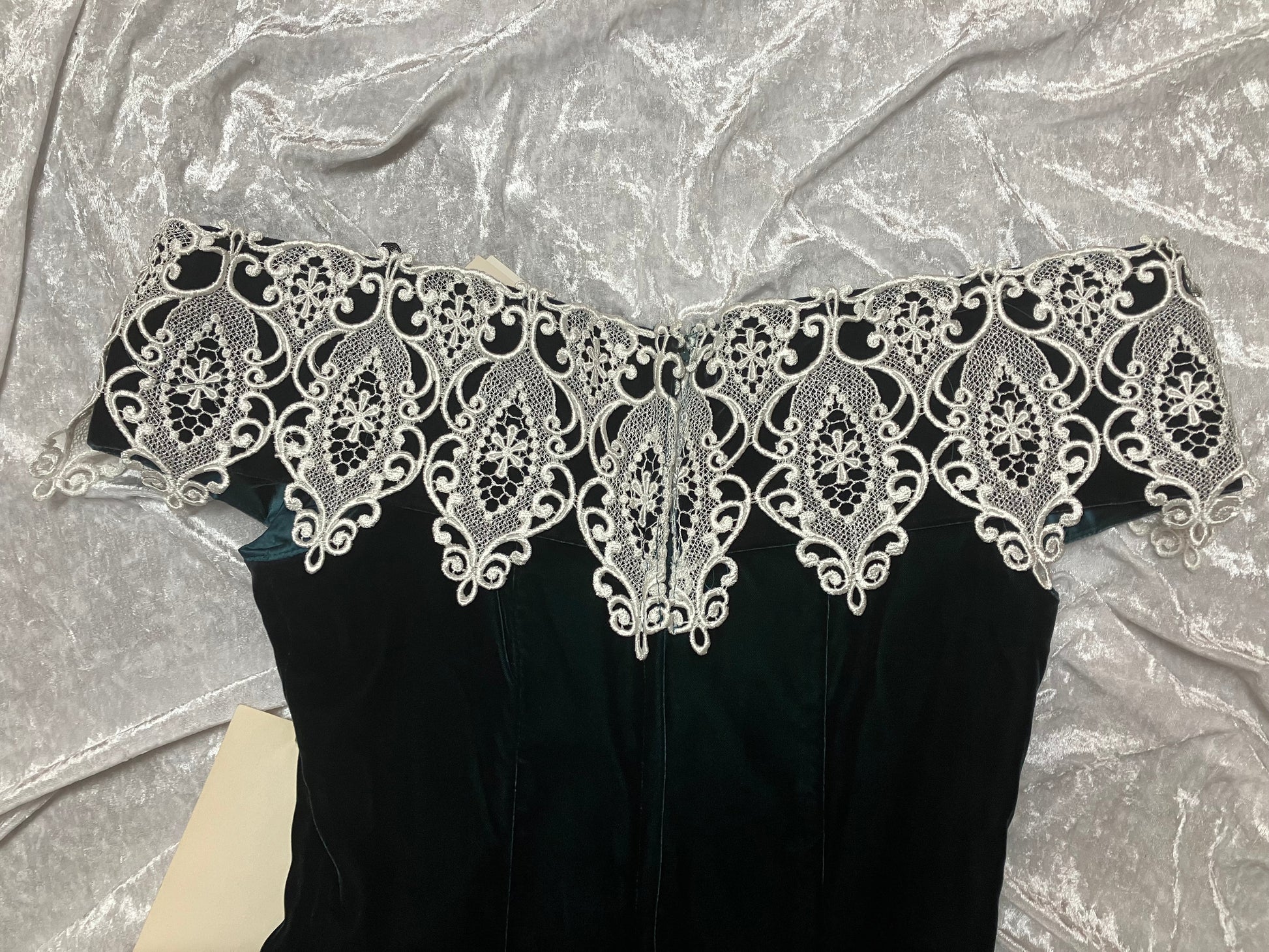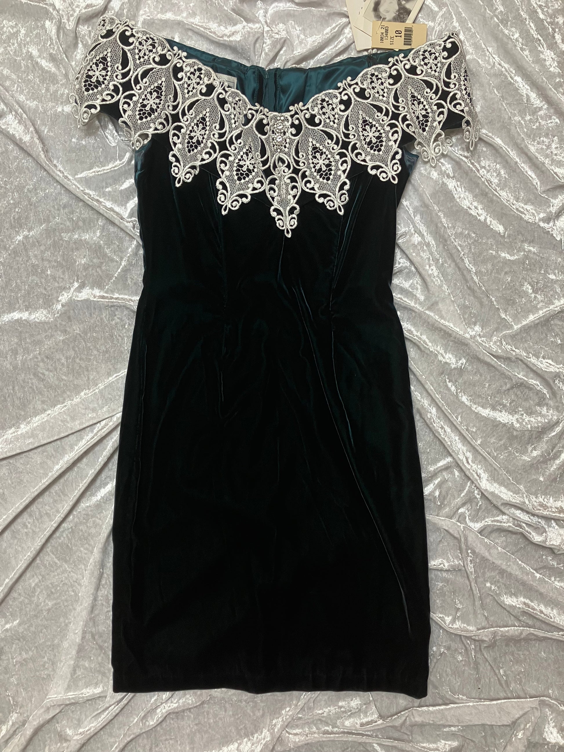 Scalloped off the shoulder neckline is adorned with a detailed lace overlay, jeweled broach accent and elasticized straps. Beautiful deep green velvet material. The front and back boning from bodice to waist create a sleek fit in this stunning cocktail dress.