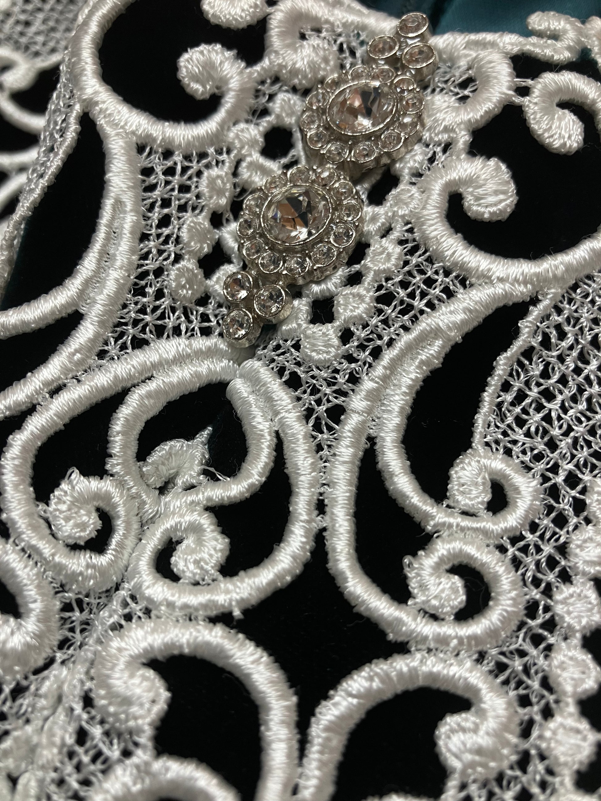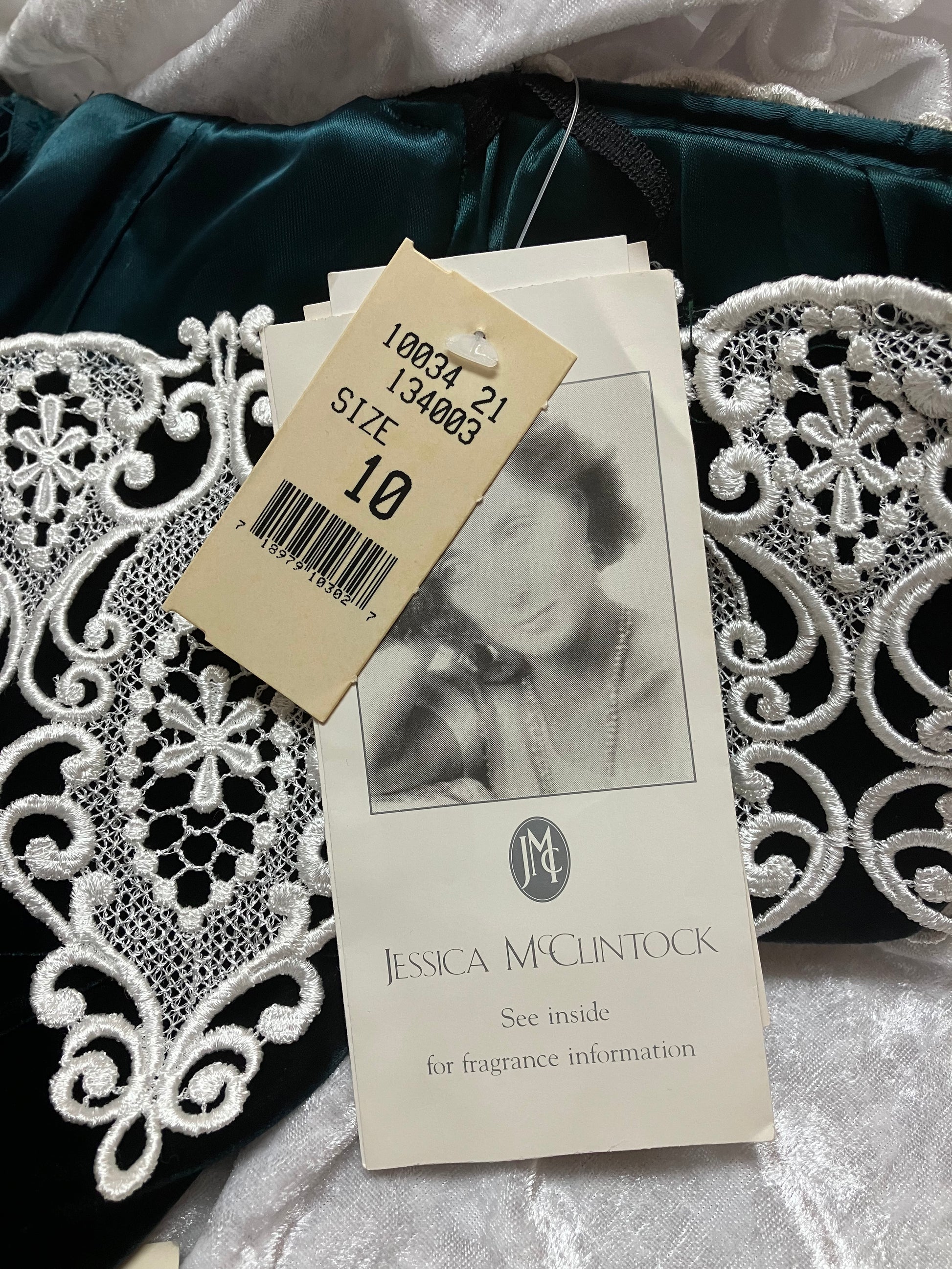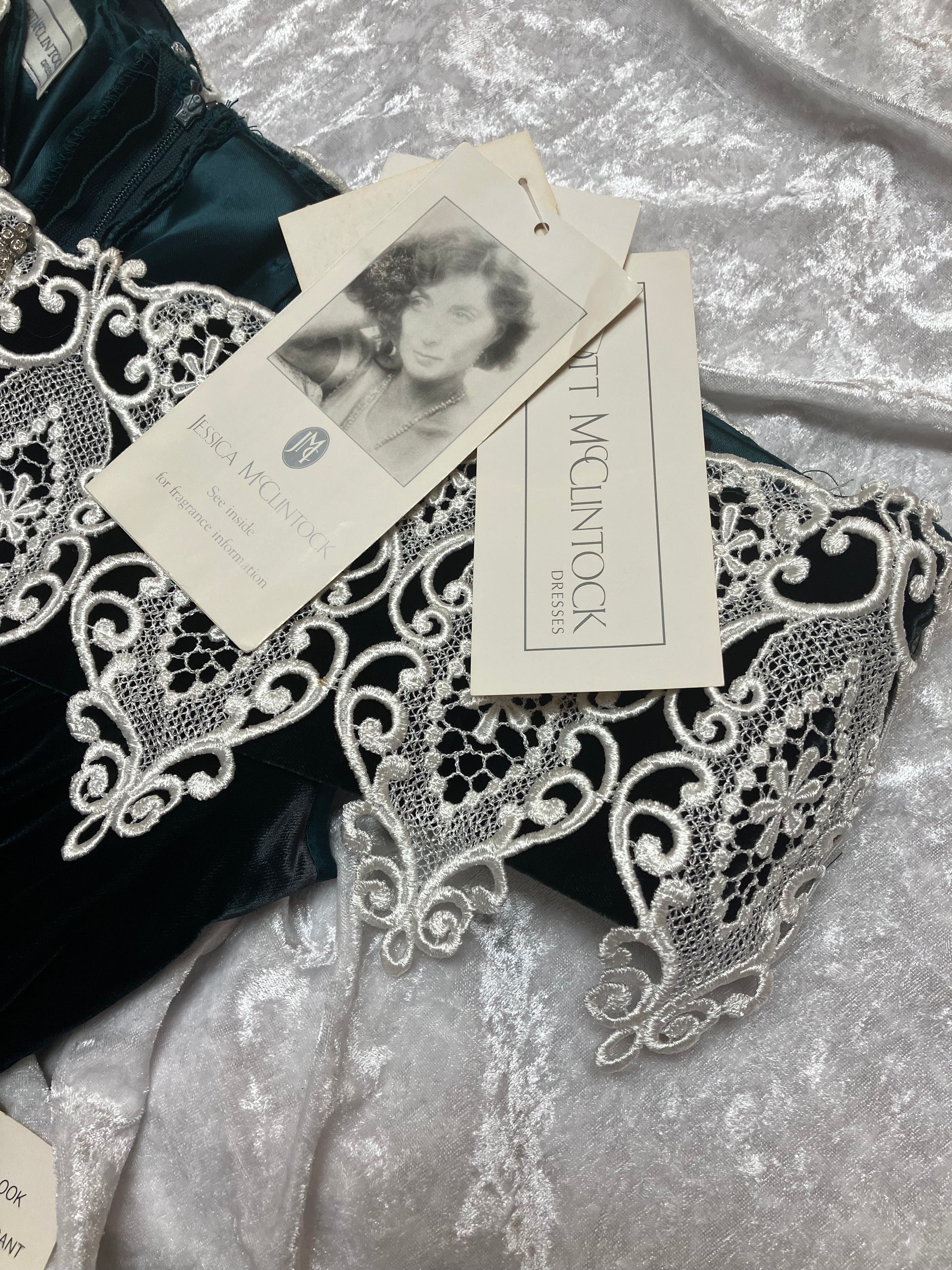 Scalloped off the shoulder neckline is adorned with a detailed lace overlay, jeweled broach accent and elasticized straps. Beautiful deep green velvet material. The front and back boning from bodice to waist create a sleek fit in this stunning cocktail dress.