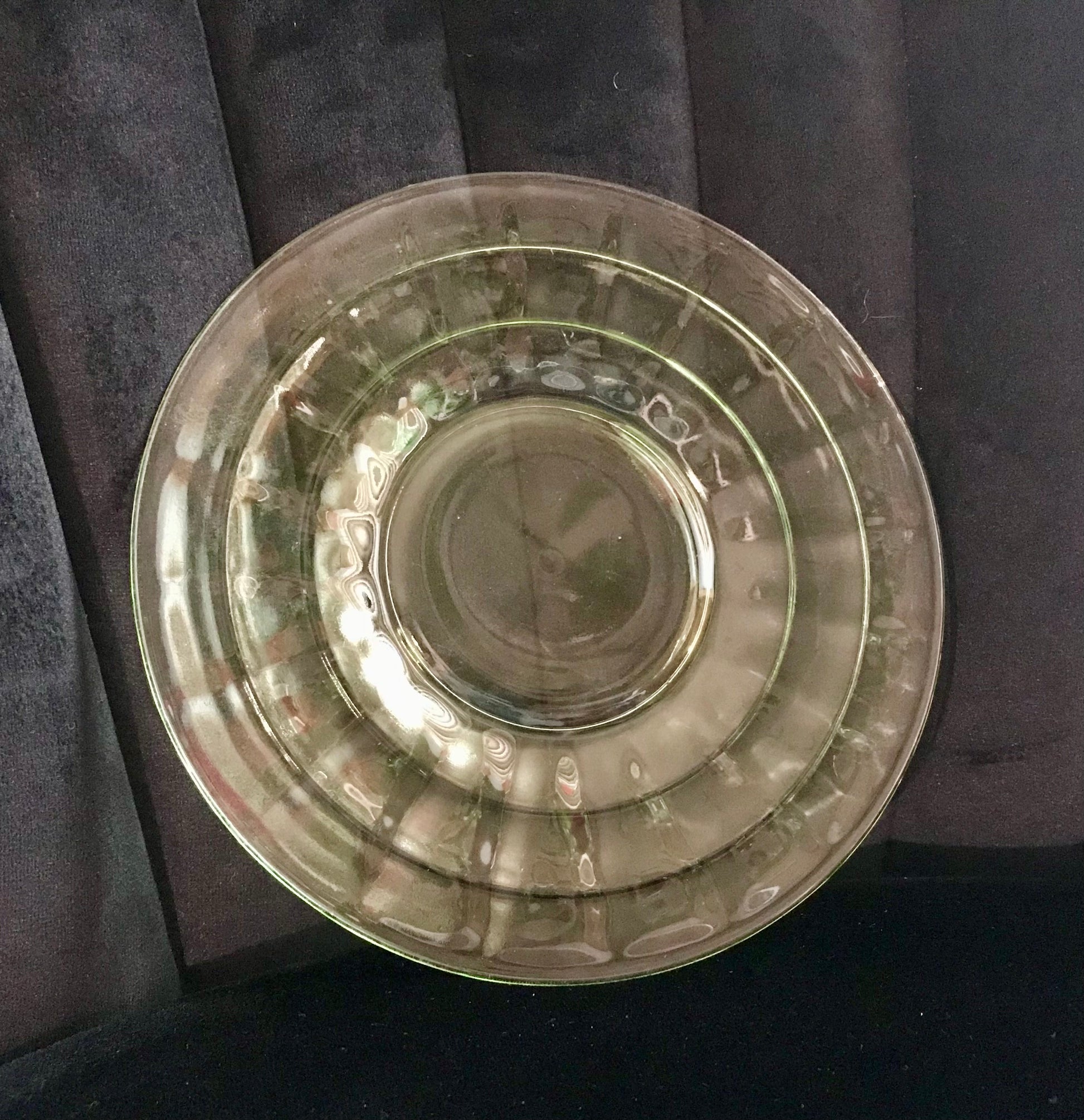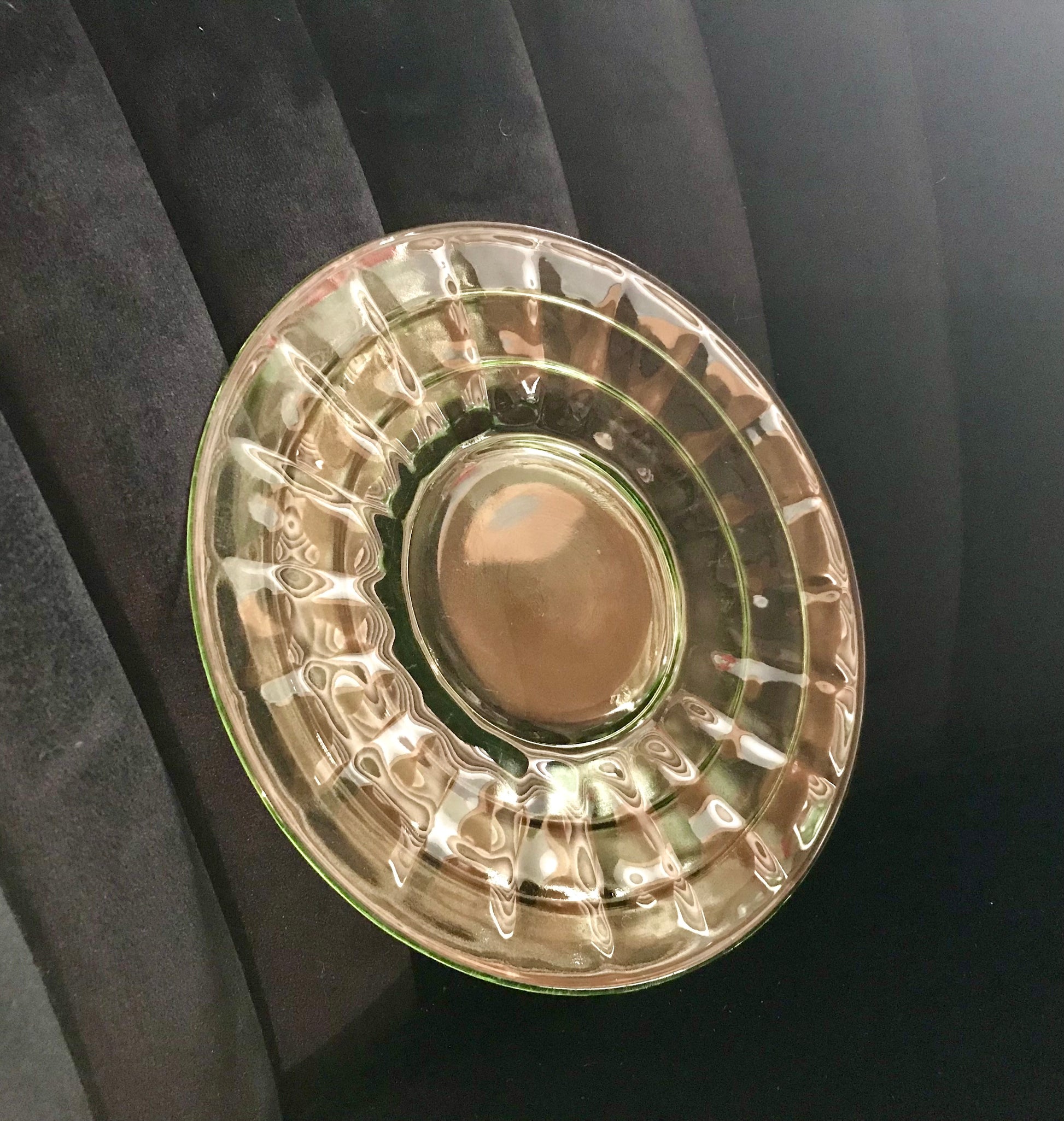 This glowing glass saucer is from the 1930s. Manufactured by Hazel Atlas Glass Co.