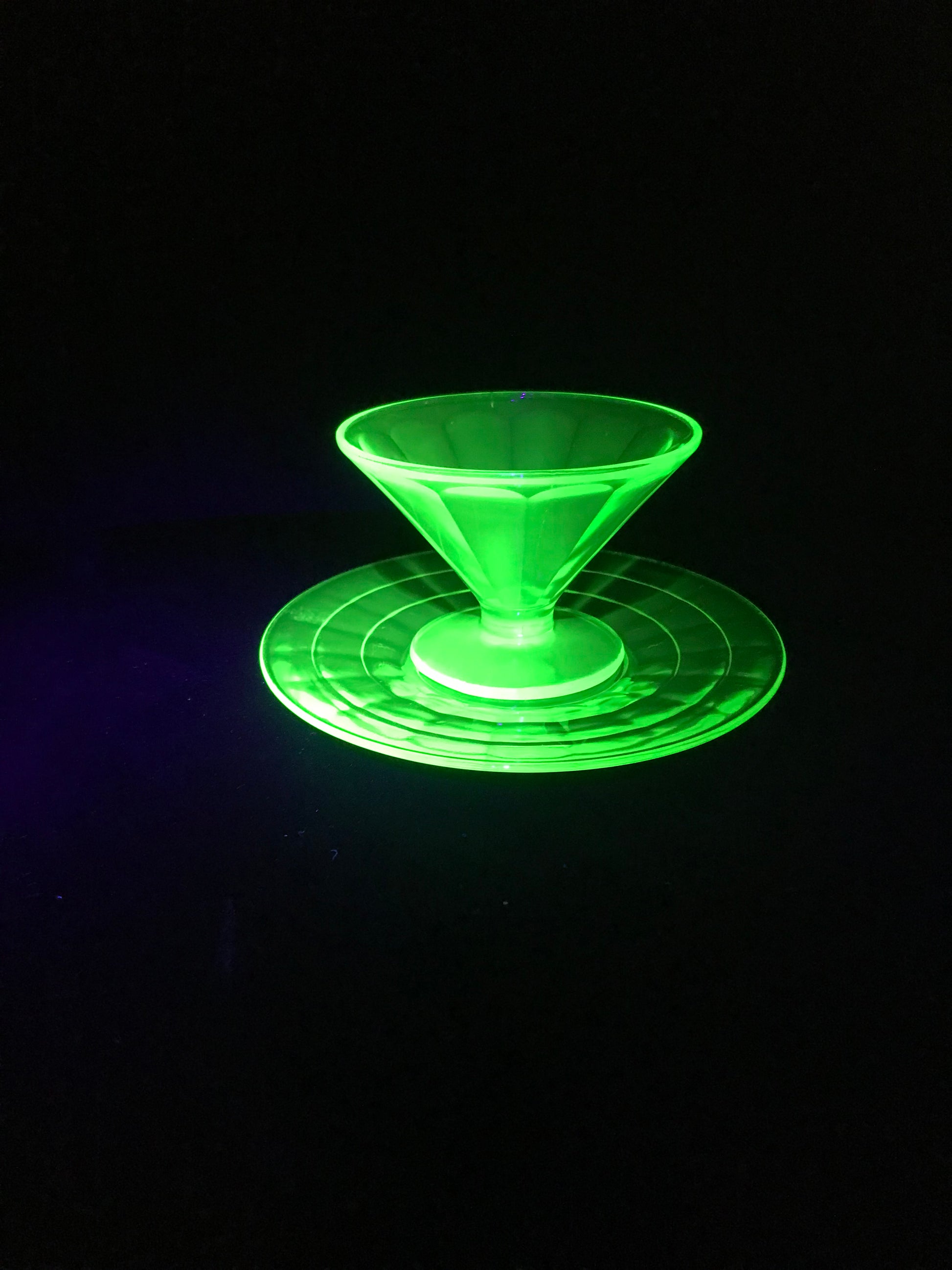 This glowing glass sorbet and saucer set is from the 1930s. Manufactured by Hazel Atlas Glass Co.