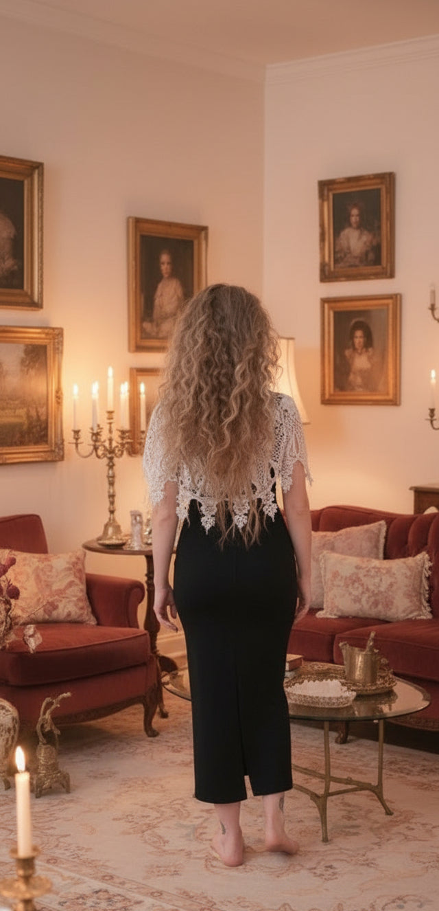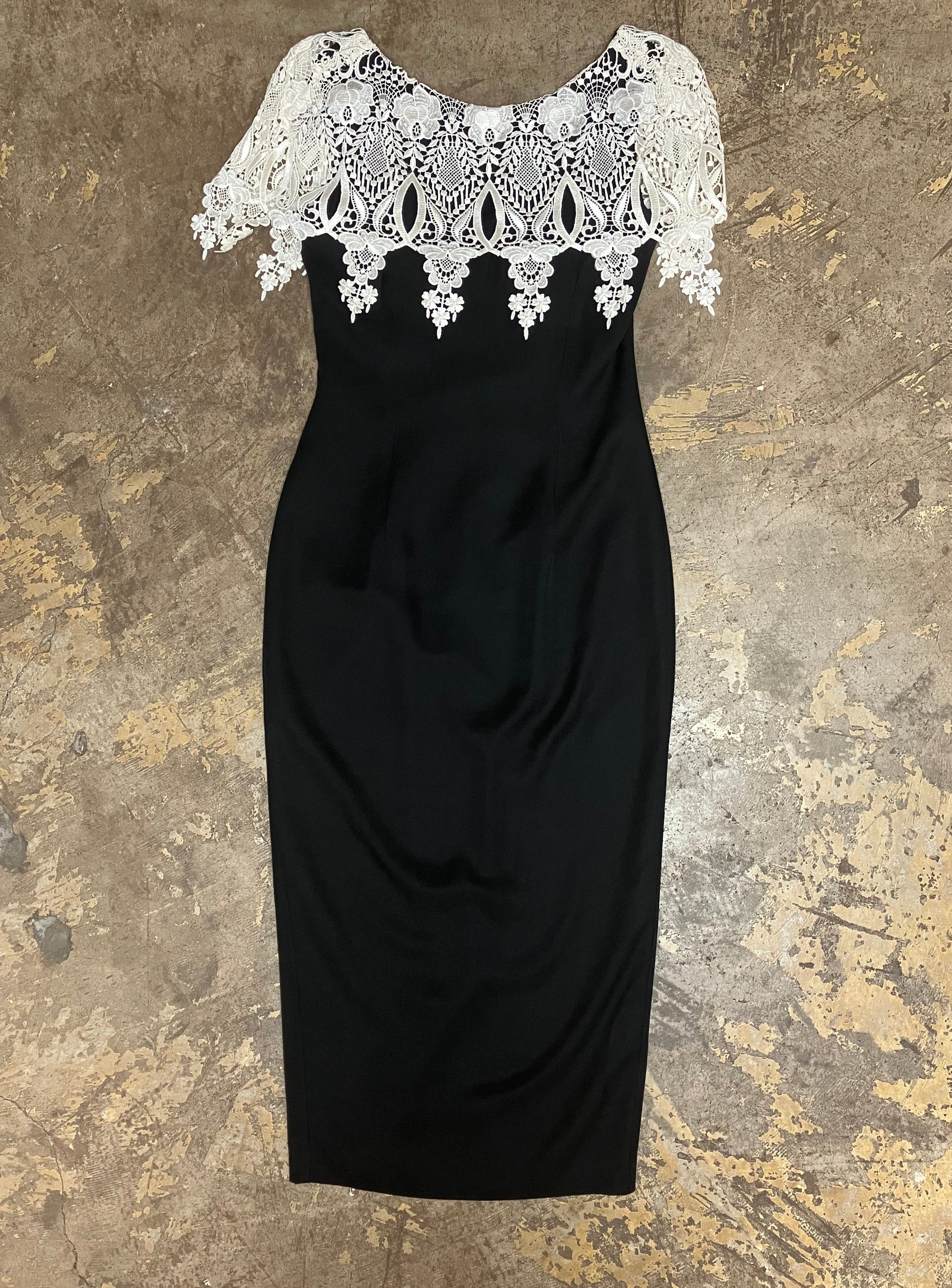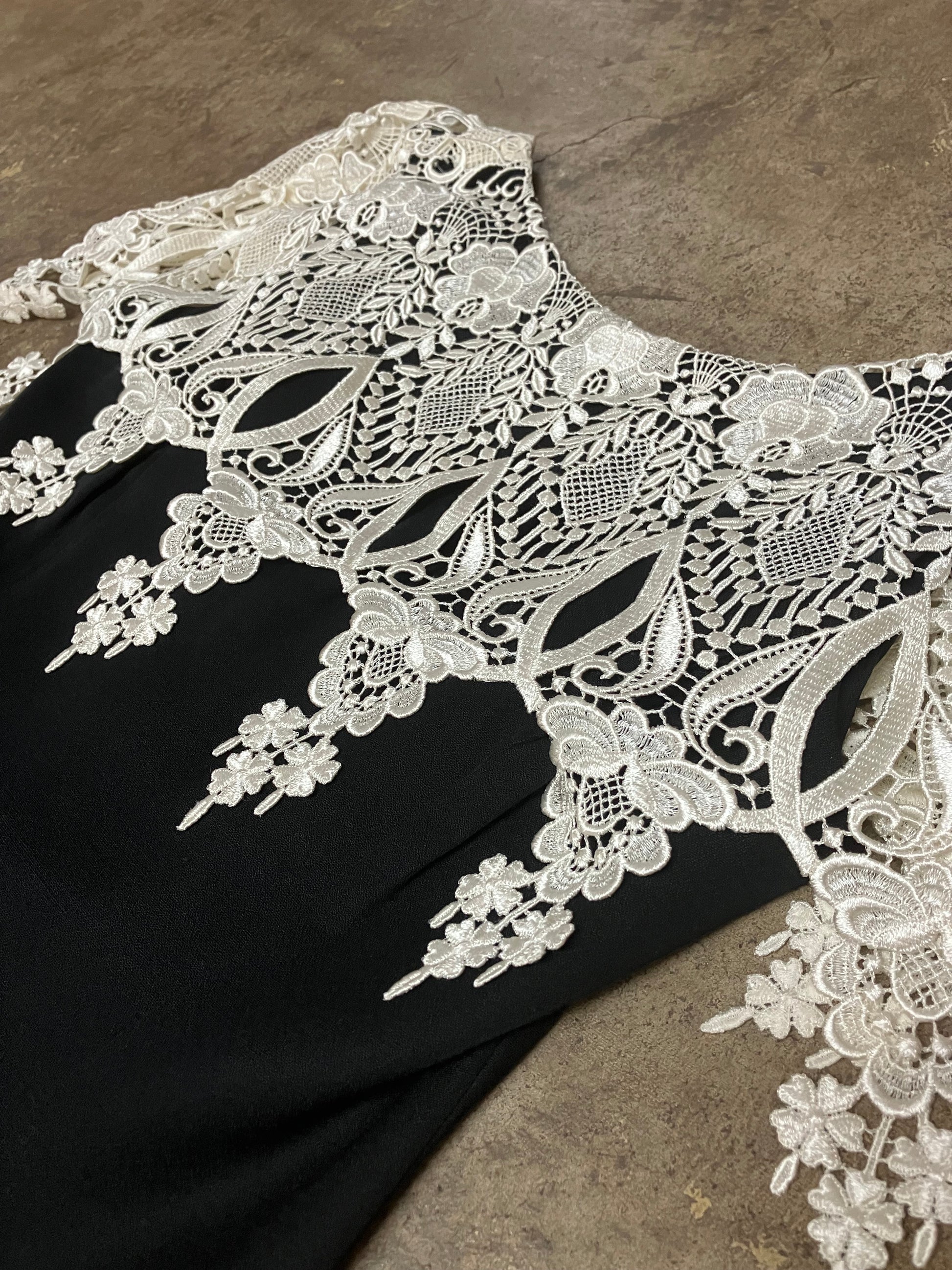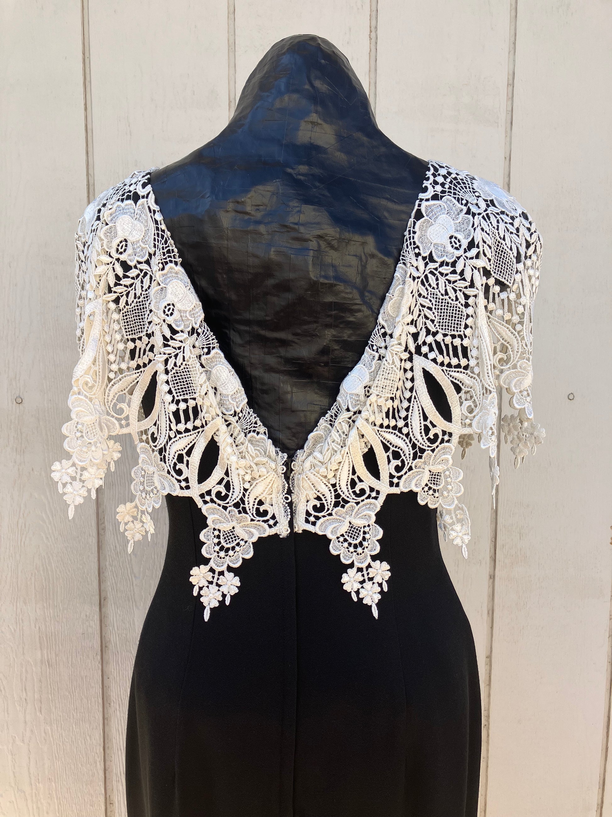 This stunning black dress features a sleeveless bodice and a sheath silhouette. Adorned by an ornate white lace overlay that forms an elegant caplet style shoulder and neckline in front and compliments the deep V shape in the back. The lace overlay is intricately patterned with a floral and paisley motif with a scalloped, dangling edge creating a romantic and feminine touch.