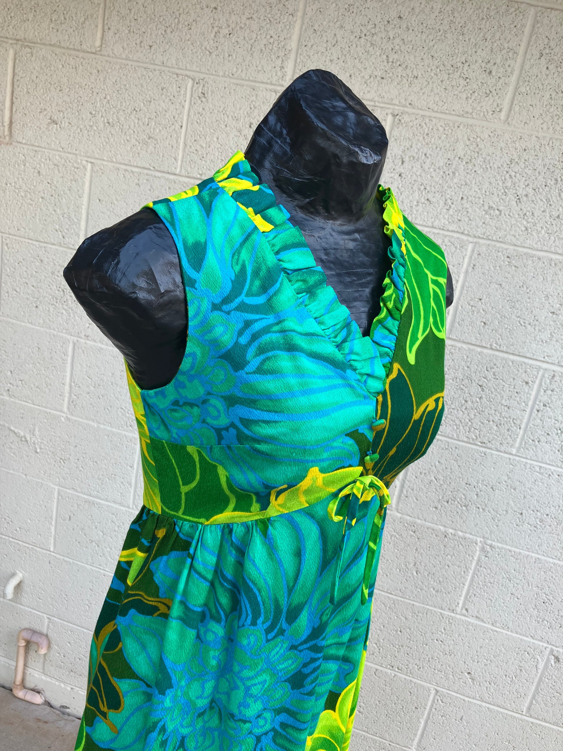 This stunning 60's maxi dress by Liberty House of Hawaii is ridiculously vibrant. We're digging the oversized floral print in spectacular tones of teal, greens and blues. Just look at those colors!! This maxi darns an empire waist, accent fabric buttons and bow front accent along with a zipper back closure.