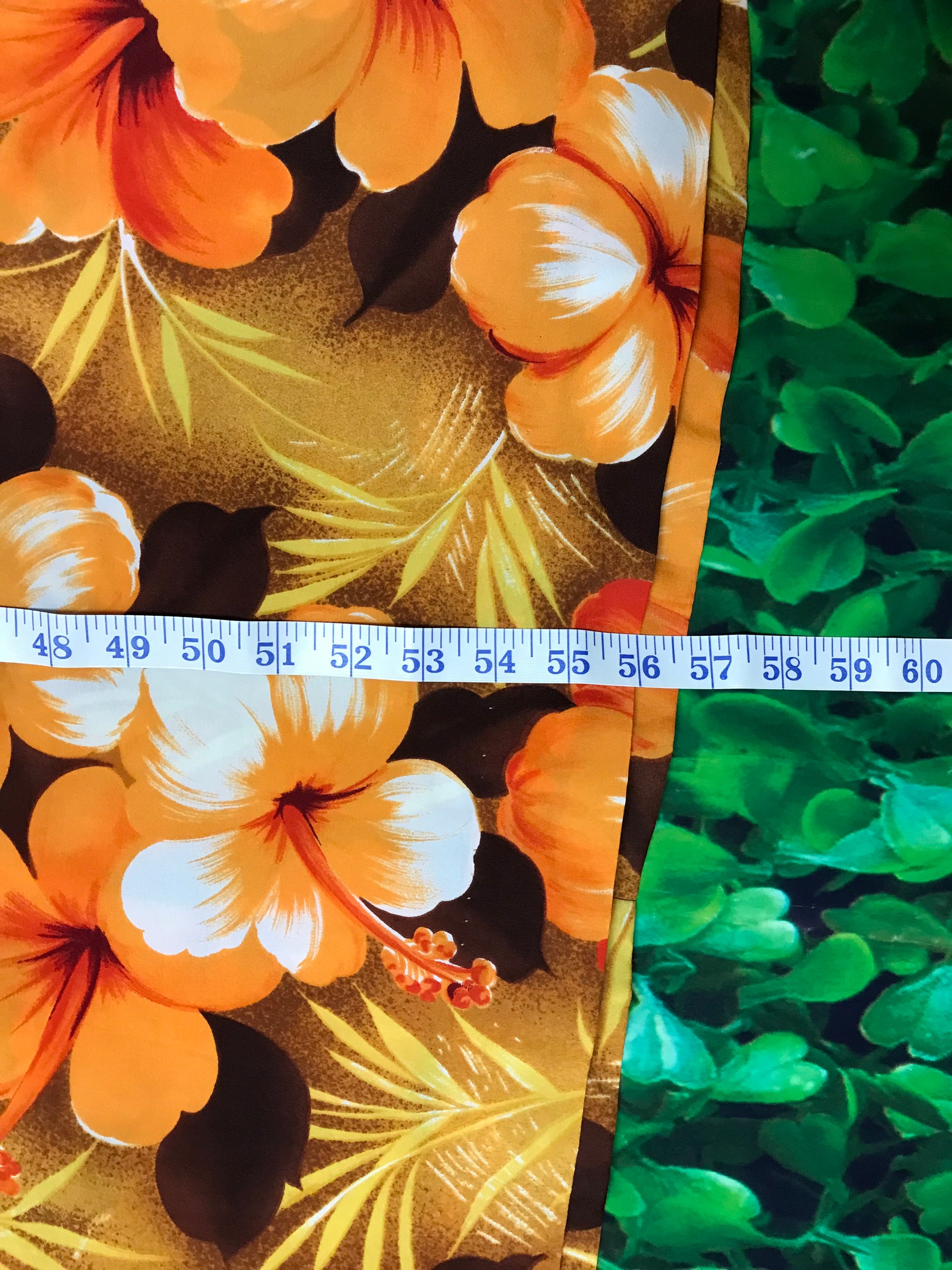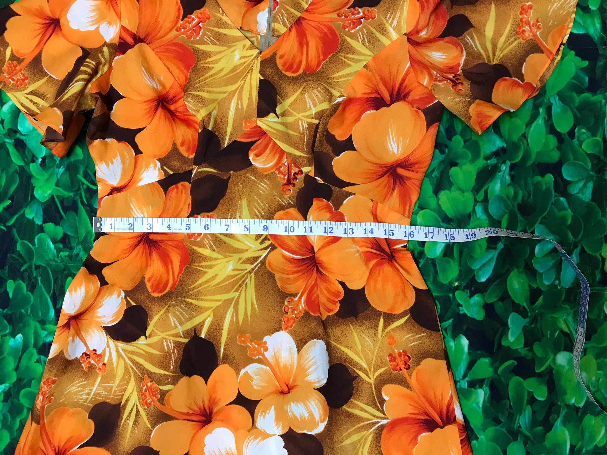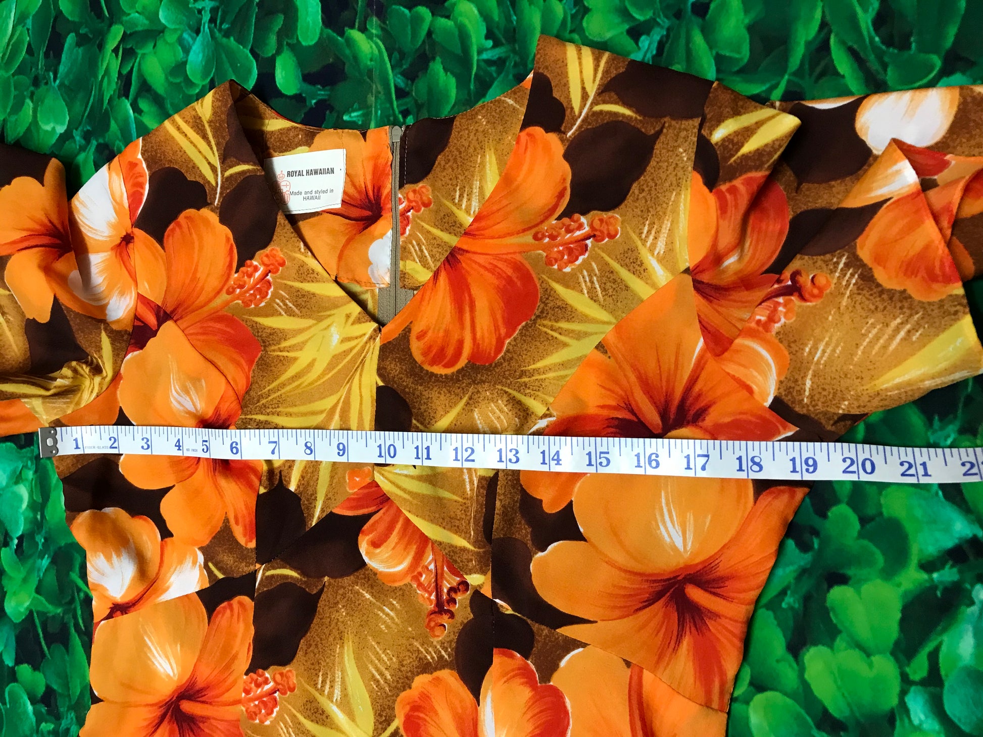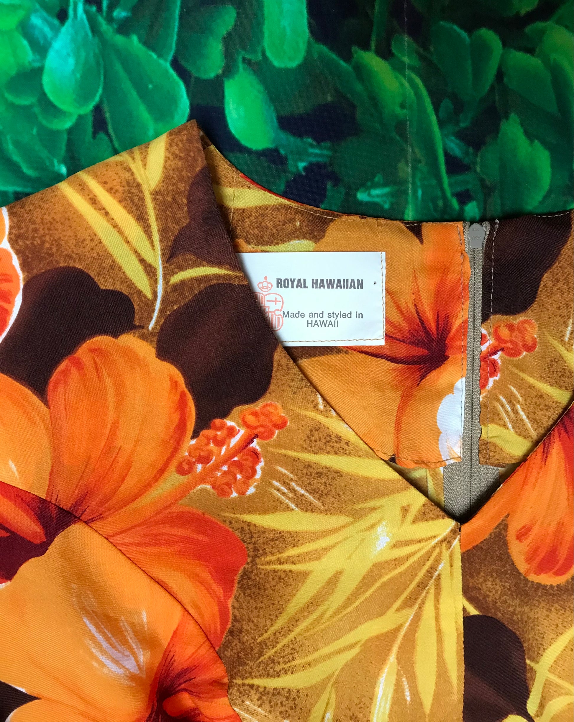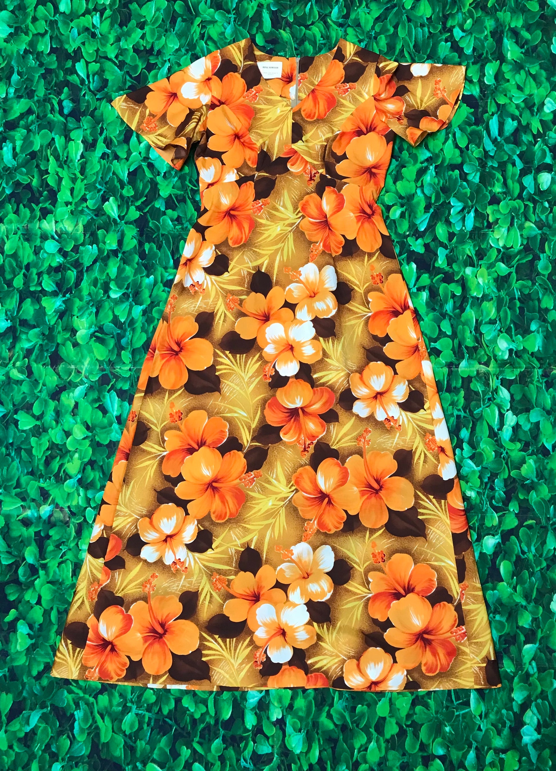 Embrace the colors of the sunset and feel the island vibes in this vibrant Royal Hawaiian dreamy dress. If your swooning for that vacation feeling this darling delivers with rich tones of gold, orange and brown in an oversized hibiscus print.
