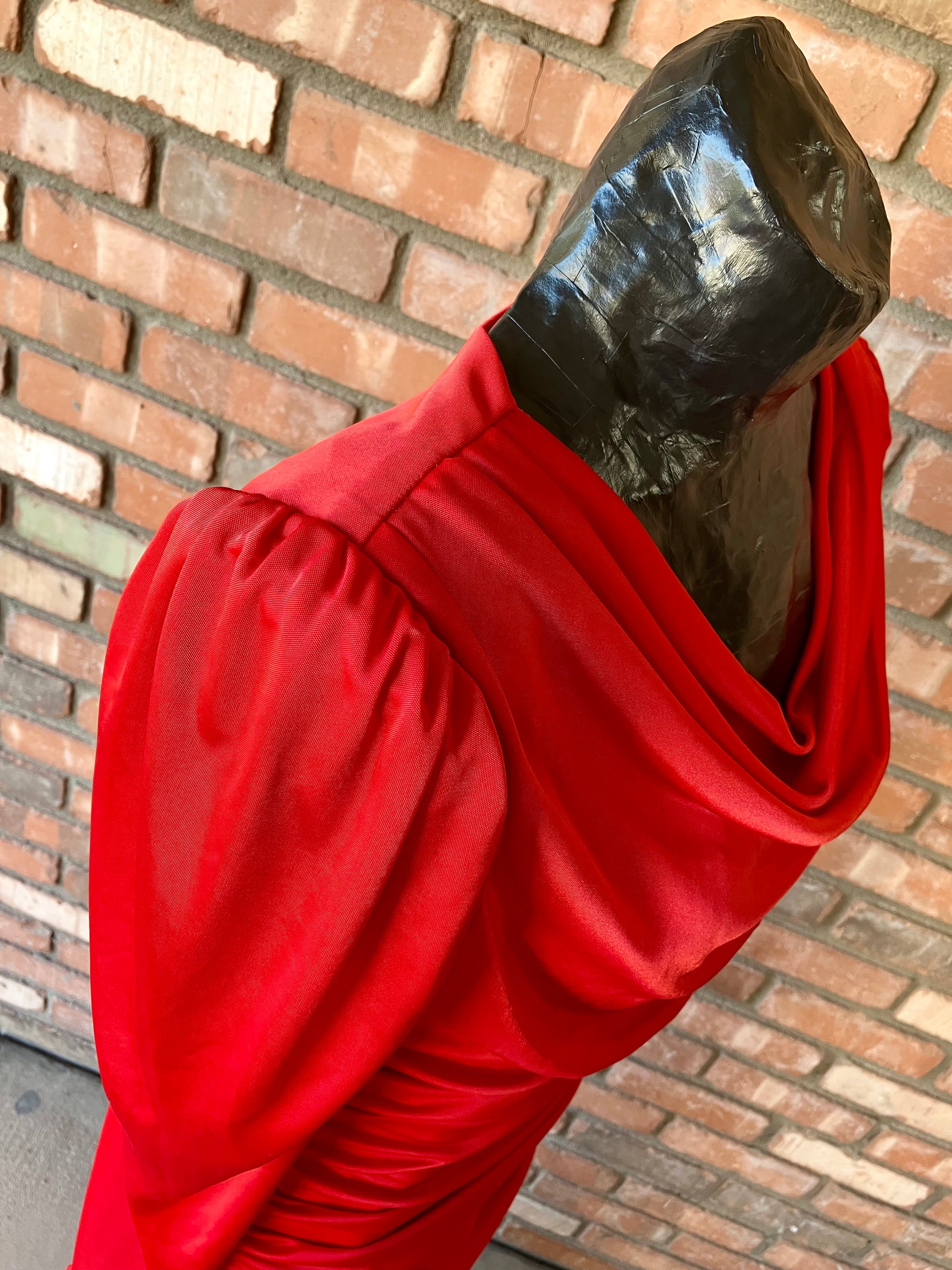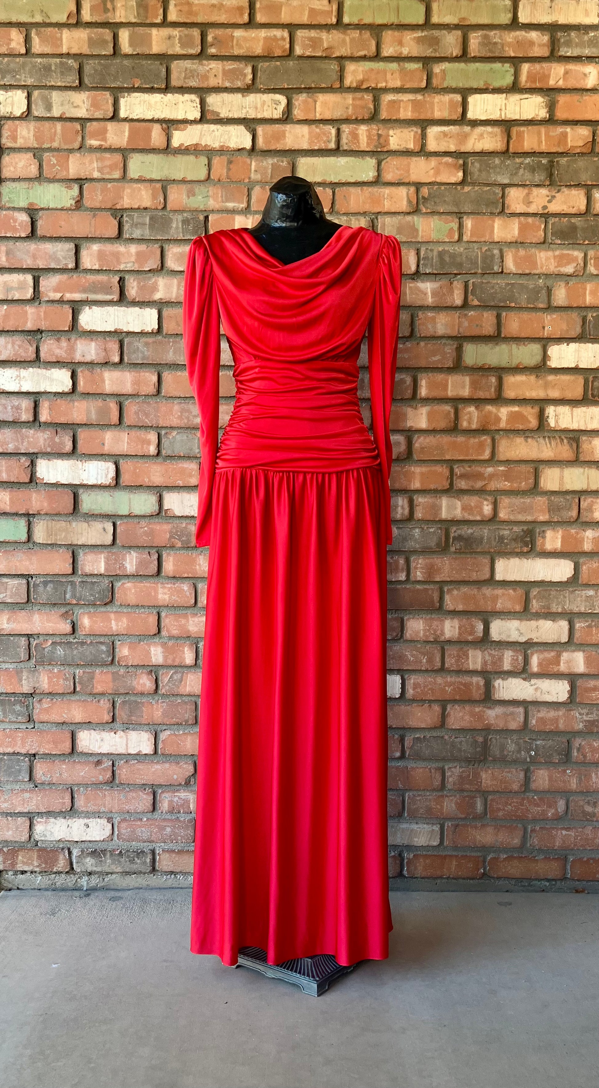 Ready to be the ravishing beauty in ruby red? This vibrant red late 70's maxi dress is a true gem! This stunning maxi features a draped cowl neckline along with long sleeves that include a subtle puff details at the shoulders and snap close cuffs. We're loving the incredible ruched waistline and the form fitting slimming effect created with this design. Made of a silky semi-sheer polyester material with a bit of stretch, perfect to fit your curves. All those amazing details paired with the smooth floor length silhouette of the skirt offers a fierce formal style.