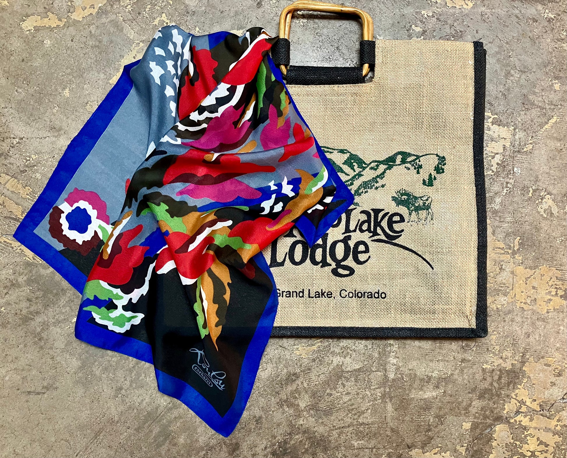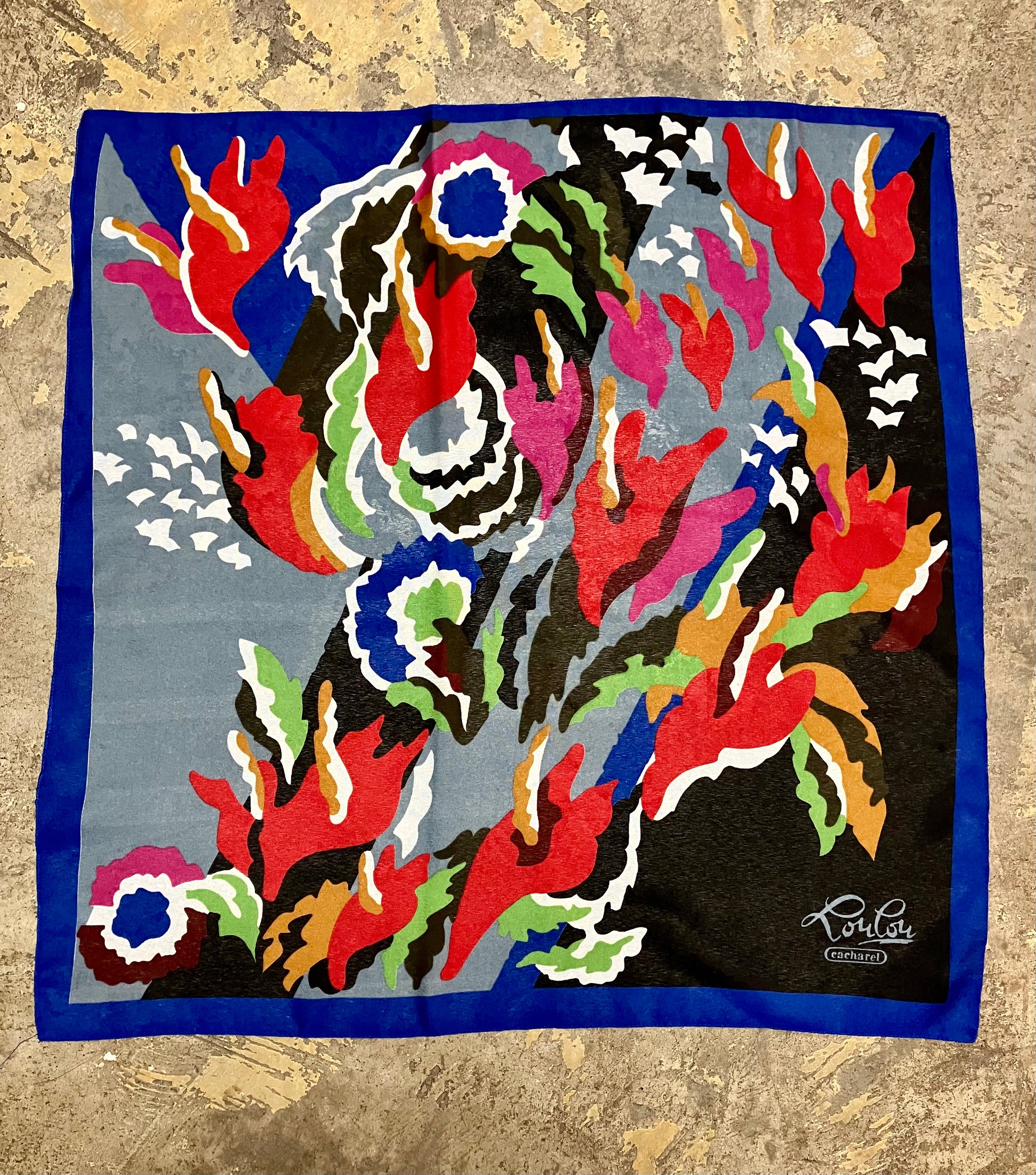 We're digging this 80's Cacharel scarf with it's bright, bold abstract floral pattern
