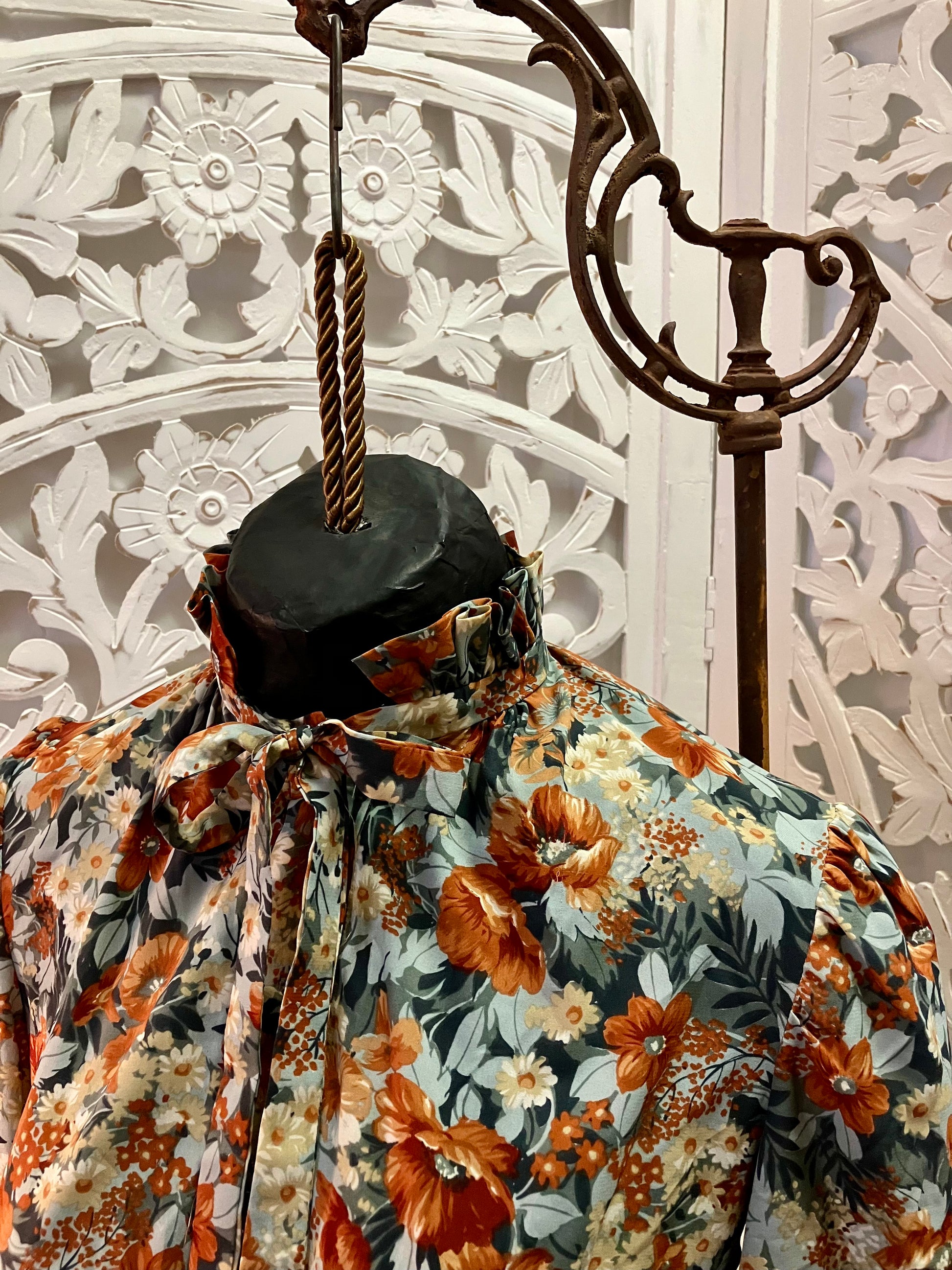 This stunning Shannon Rodgers midi dress gives all the feels of fall. Stunning orange, creams, browns and blue floral pattern compliments an iconic 70's style. Adorned with fabric buttons, dainty necktie collar closure and pockets!