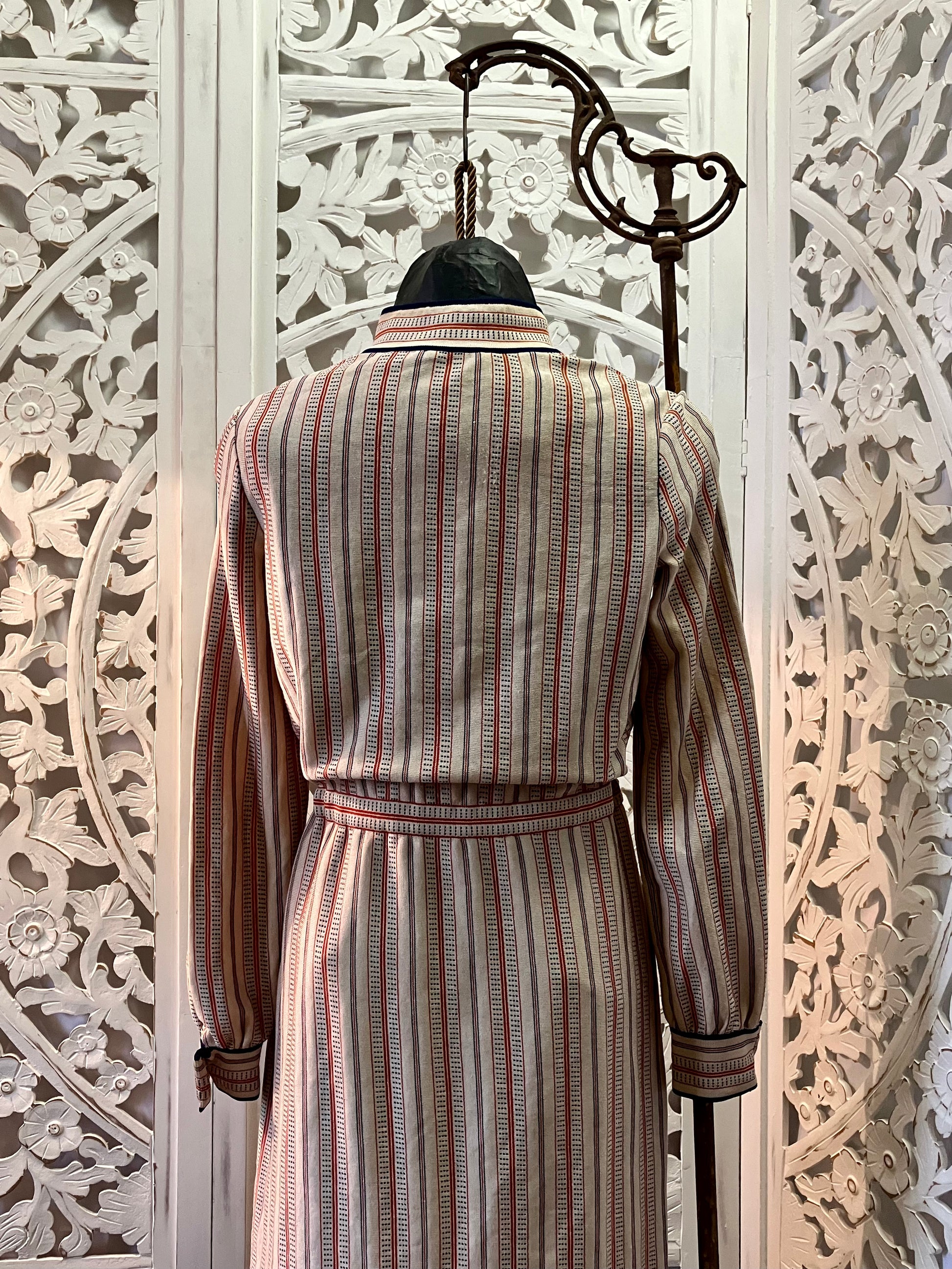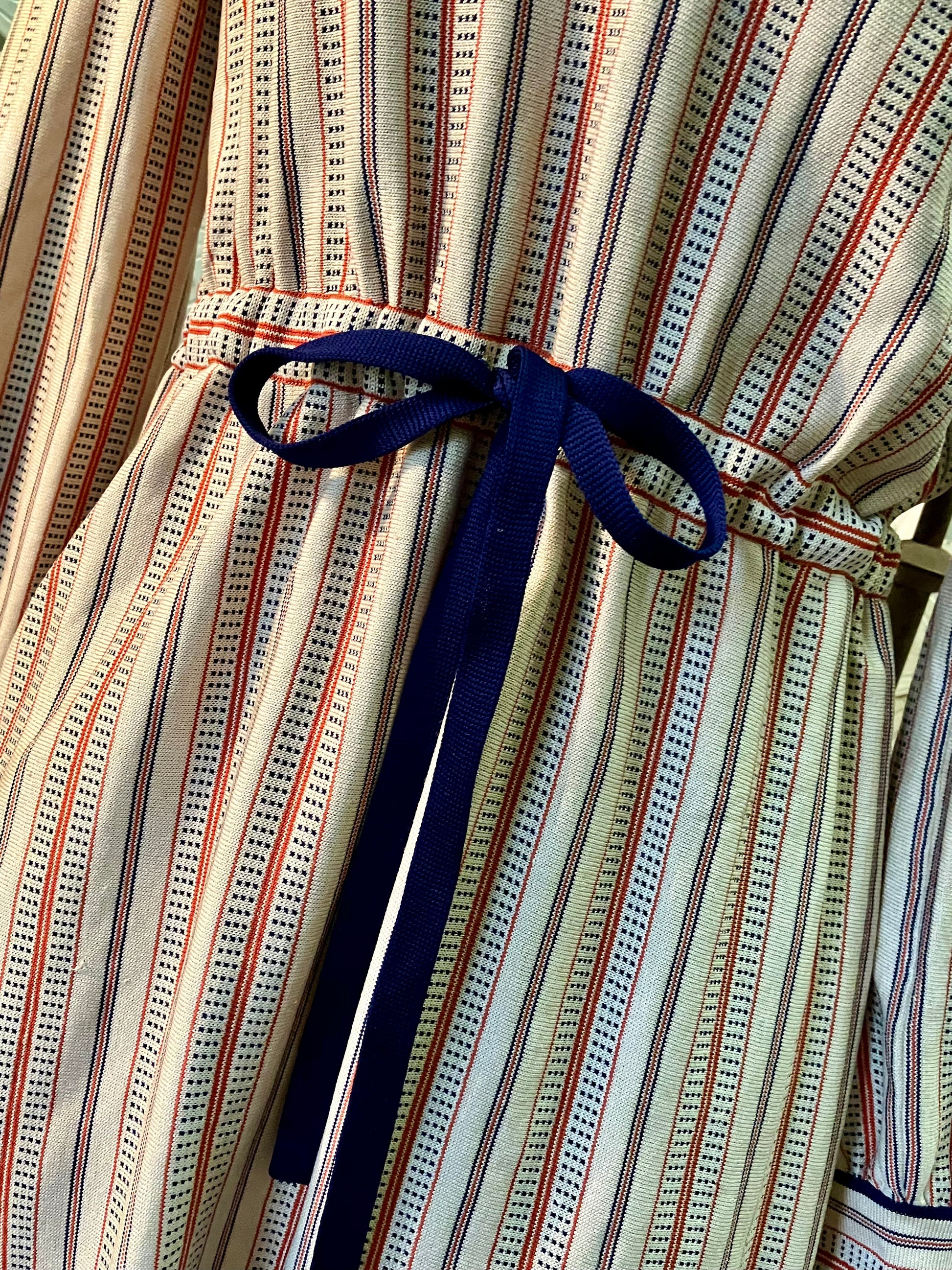 A drawstring waist, button cuff sleeves and a high collar midi just waiting for a pair of Candie's wooden slides.