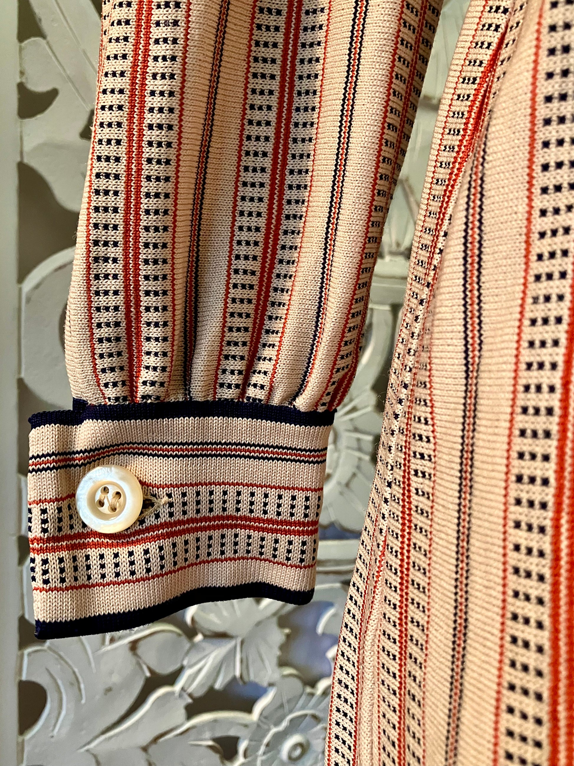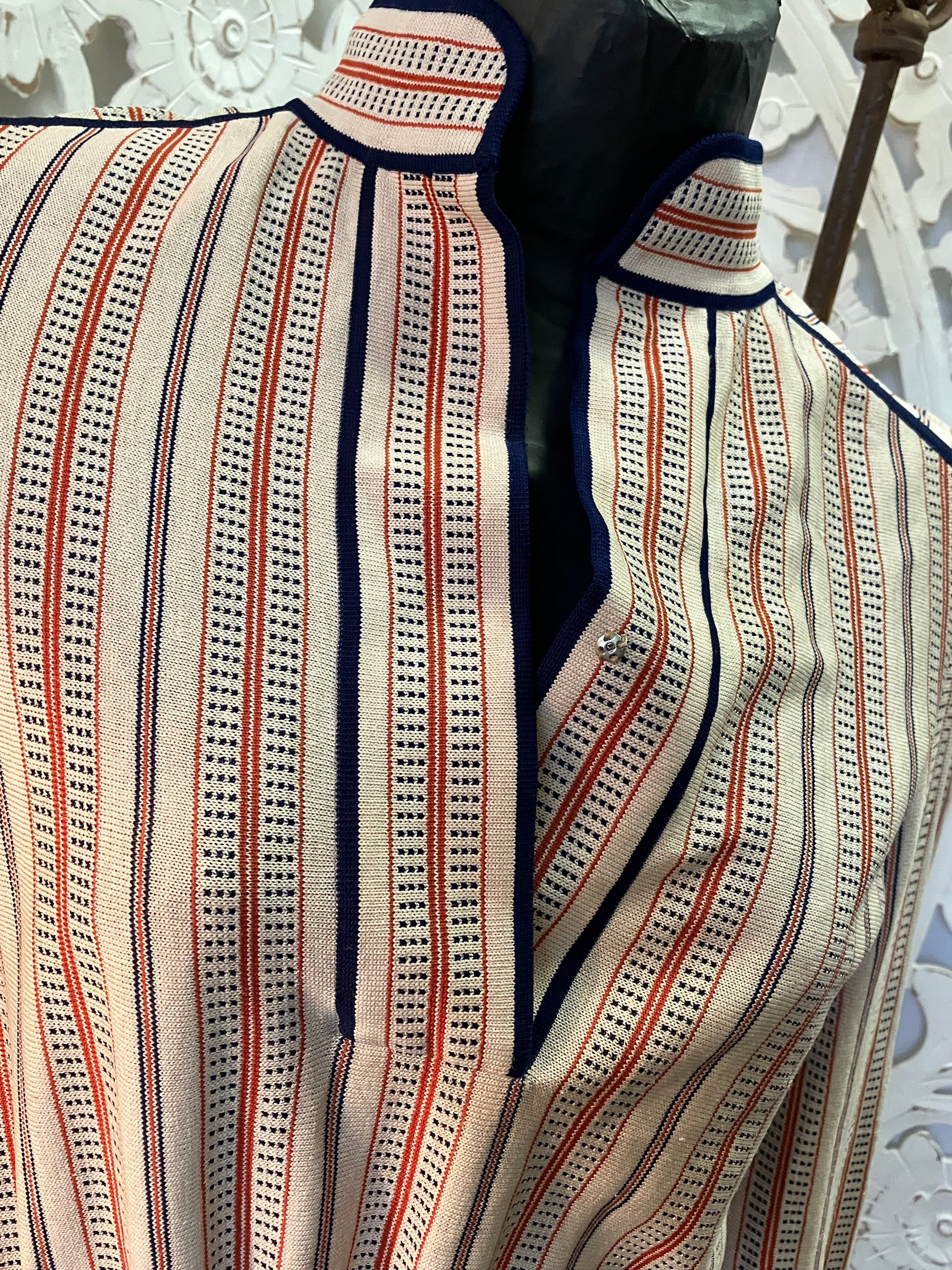 Step into true 70's vibes this fall while sporting a combo of cream, navy blue and deep orange. wearing this Goldworm number. This knit beauty brings all the warmth of fall so you can feel like the season in style.